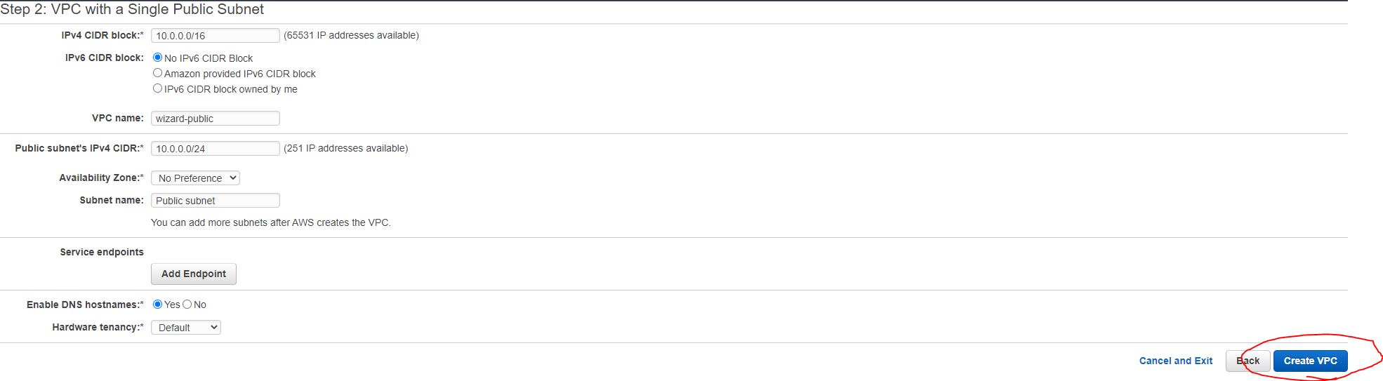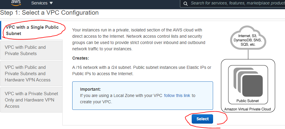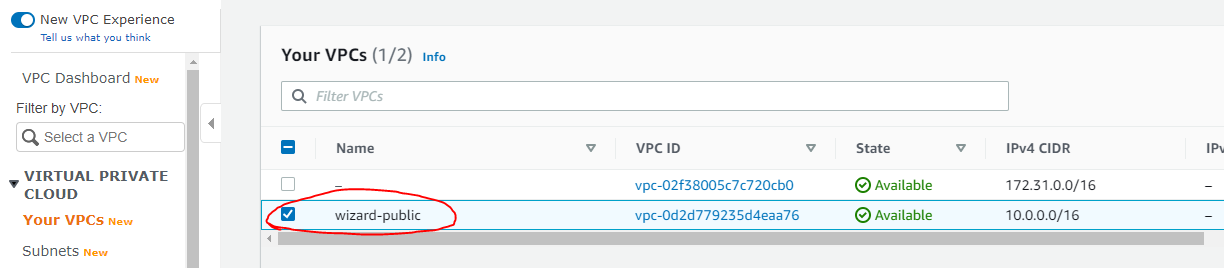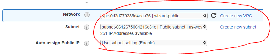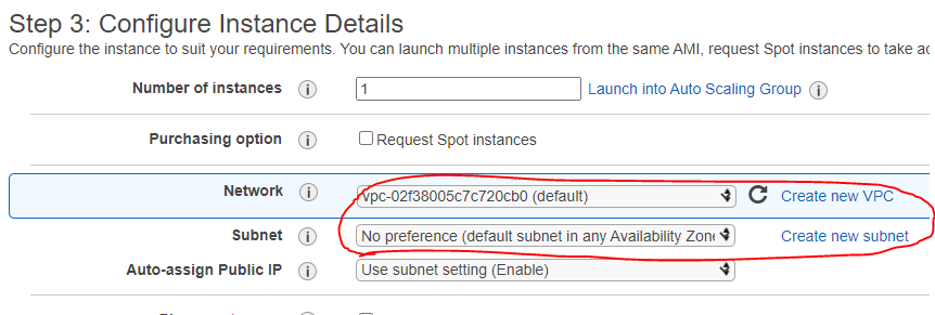 step 3에서 VPC를 Default 사용하지 말고 wizard로 만든 Subnet을 선택한다.