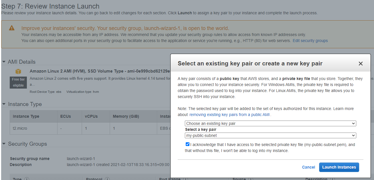 나는 my-public-subnet이라고 하는 key pair를 선택했다.