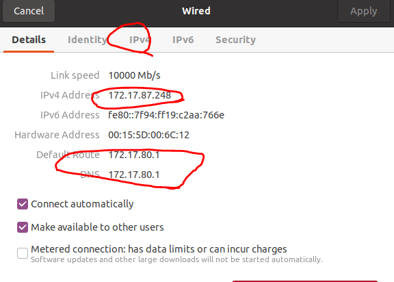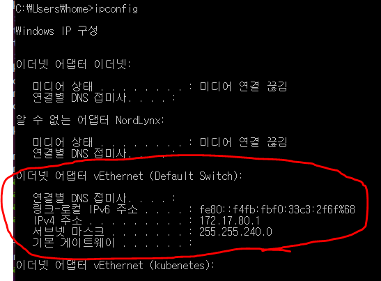 hyper V를 실행한 컴퓨터에서 ipconfg를 사용해서 vEthernet을 찾으면 된다.