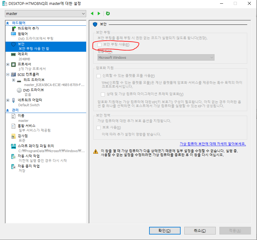 - 보안 부팅 사용을 Disable : Hyper-V에서 공식으로 인증한 Version이 아니면 작동이 안된다. Disable 해야한다.