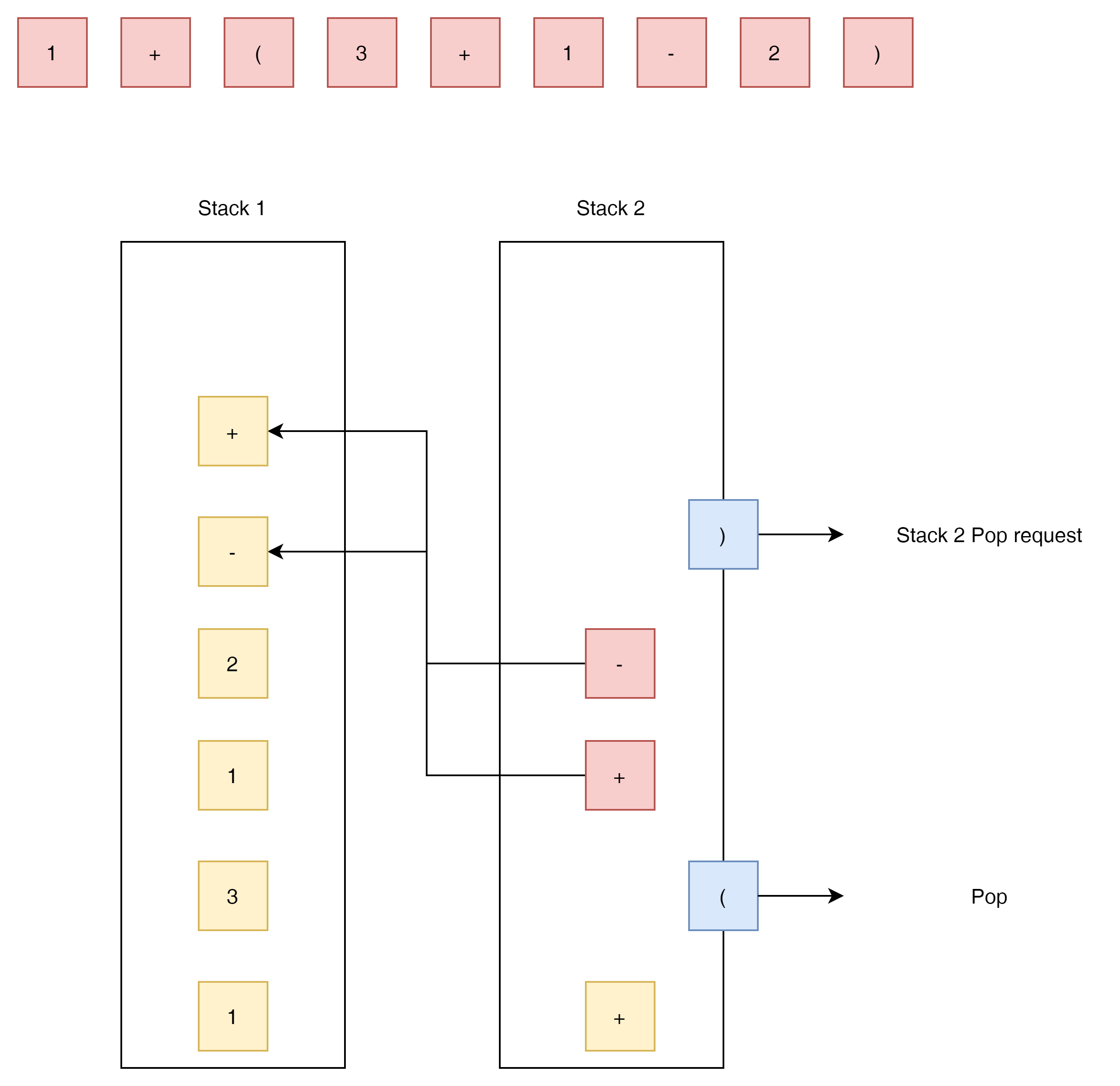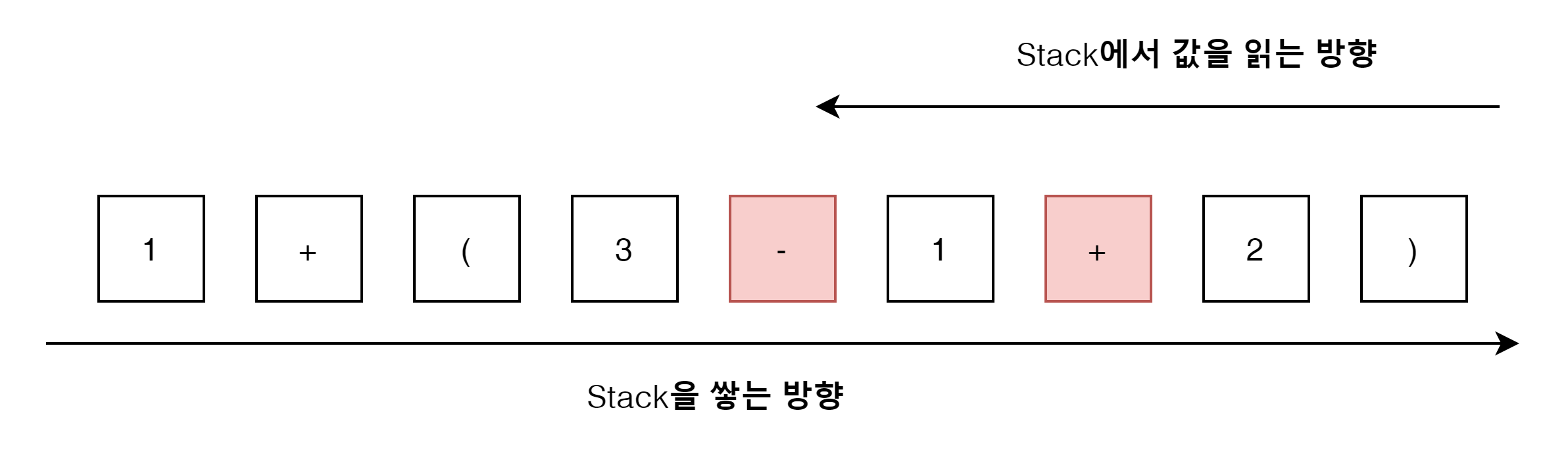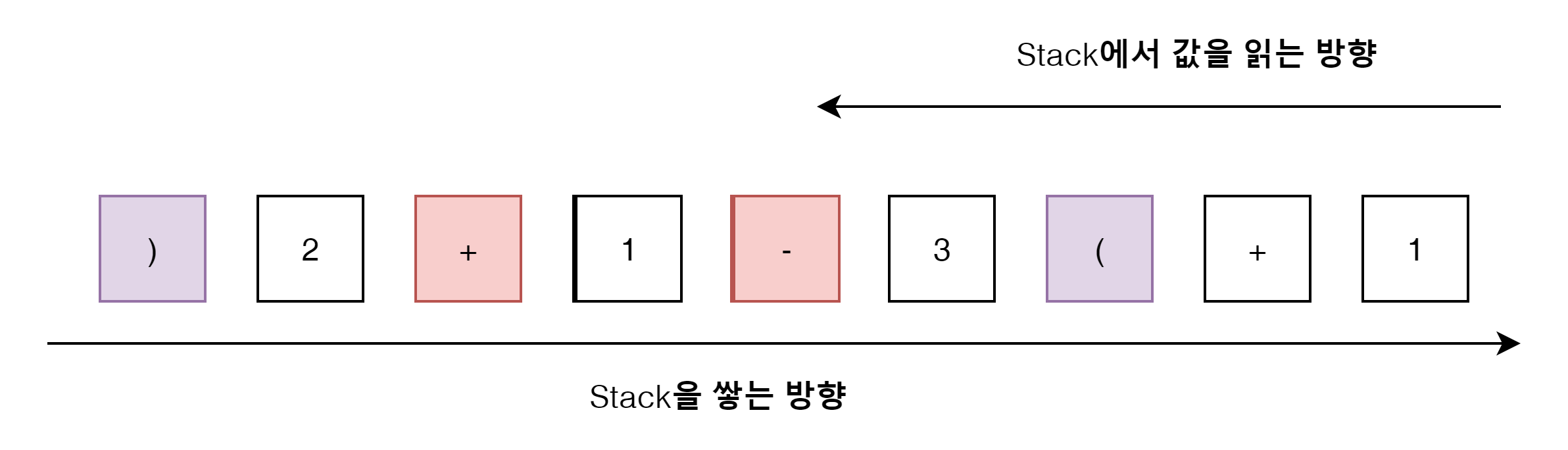 Stack을 쌓아 가는 방향은 왼쪽에서 오른쪽이 되고 Stack의 마지막으로 보이는 ')' 중괄호를 만나고 계산을 시작하면 Stack 특성상 `2+1` 을 먼저 처리 하게 된다.