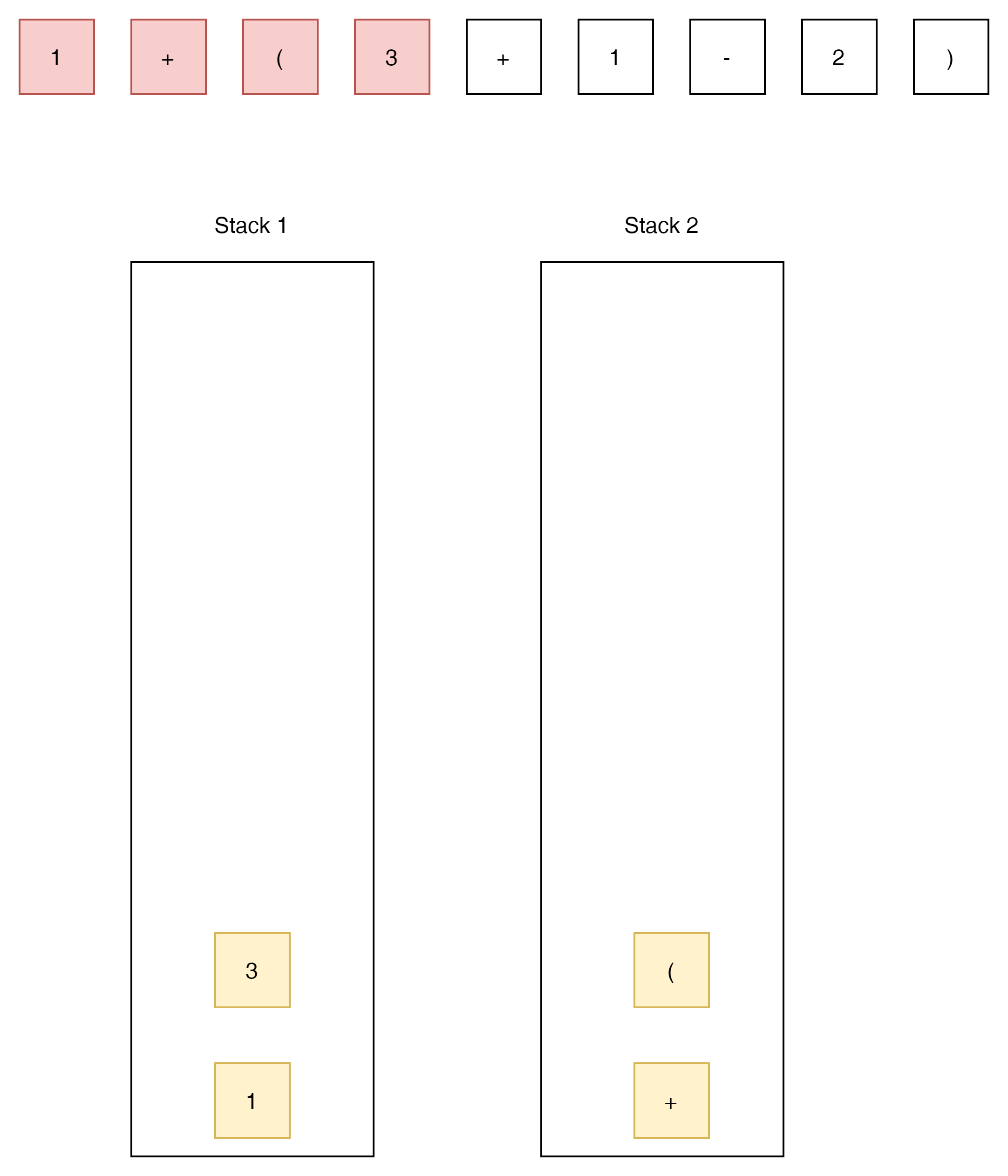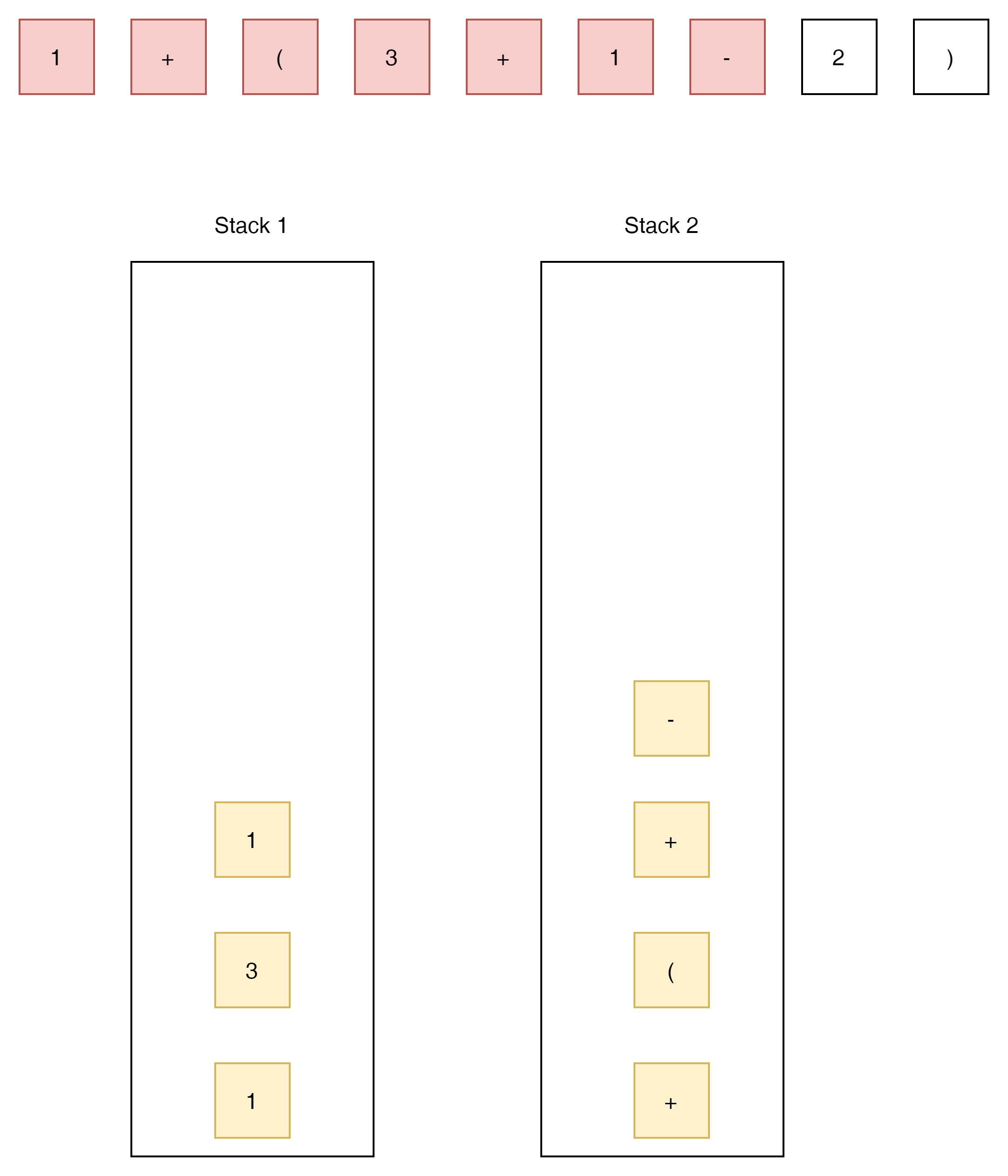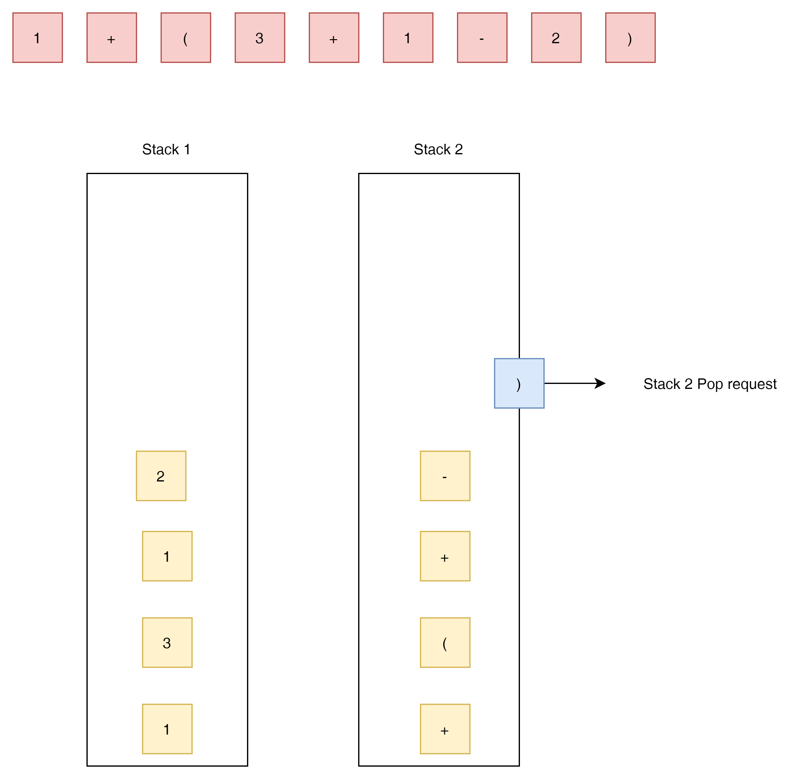 Stack을 쌓아 가는 방향은 왼쪽에서 오른쪽이 되고 Stack의 마지막으로 보이는 ')' 중괄호를 만나고 계산을 시작하면 Stack 특성상 `2+1` 을 먼저 처리 하게 된다.