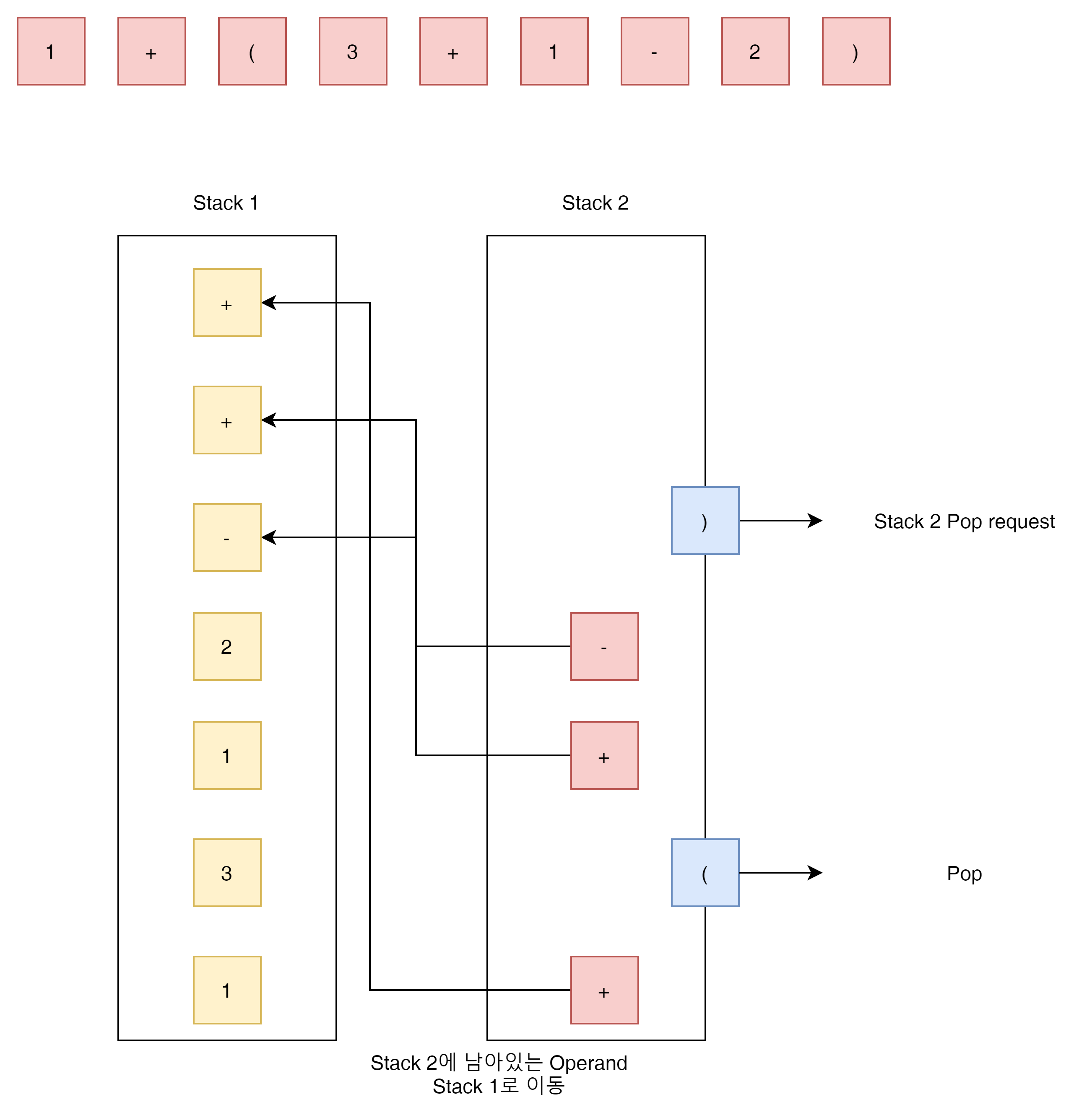 4. 2번 Stack에서 ')' 좌측 대괄호를 만나면 2번 Stack에 있던 Operand를 1번 Stack으로 옮긴다.