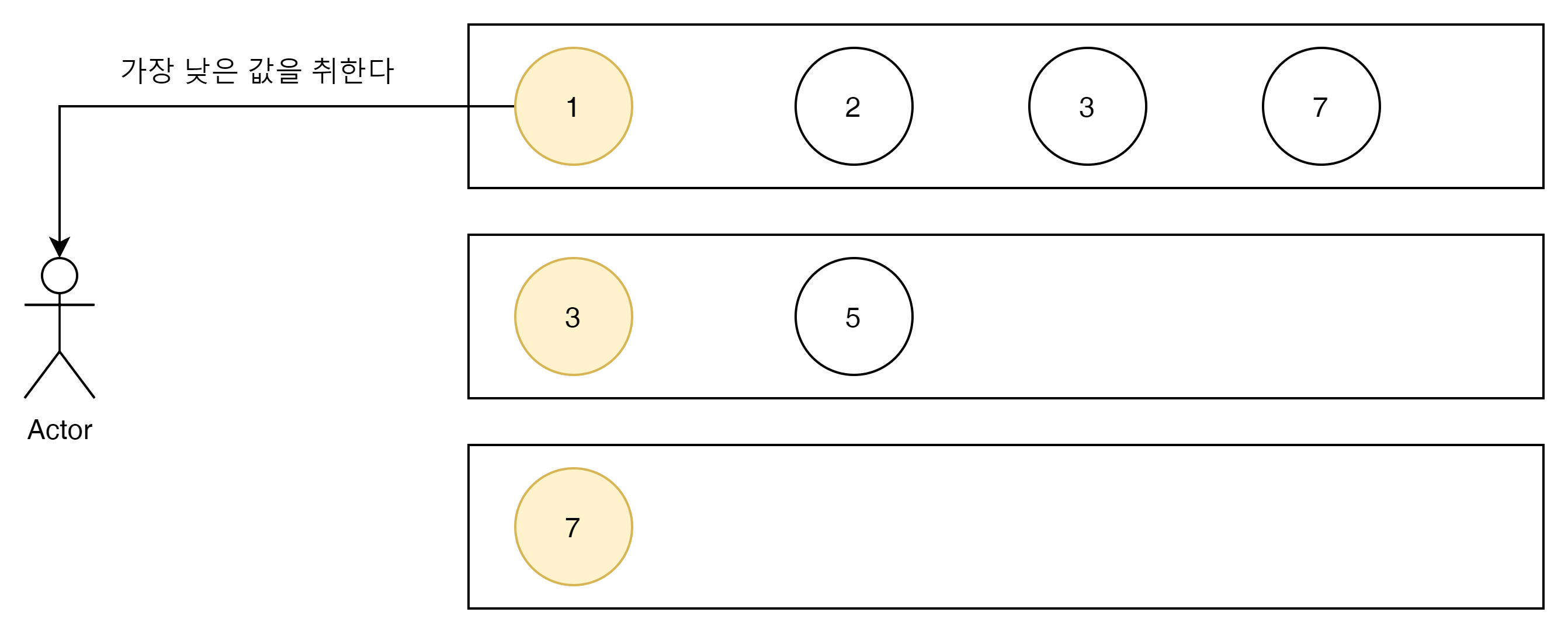 가장 쉬운 방법은 N개의 Node중 첫번째 노드의 Value를 상호 비교 하면서 List를 하나씩 Pop 하는 방법이다.