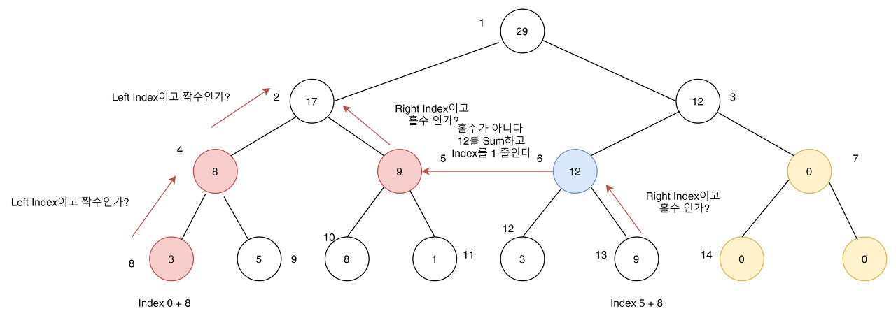 - Right Index는 홀수를 기준으로 한다. 만약에 짝수 즉 Index 12가 들어온다면 Node를 위로 올라갈 필요 없이 3을 Sum에 저장하고 Node 차수를 하나 내려서 Index 11로 시작해야 한다.