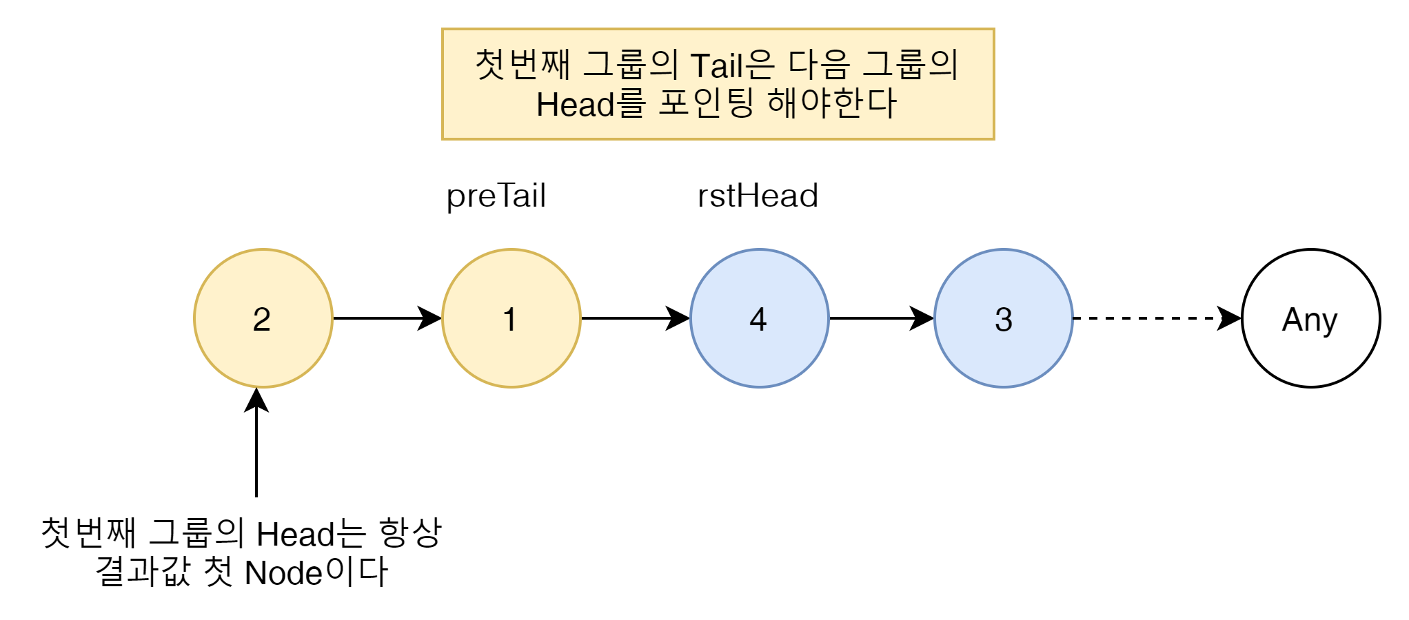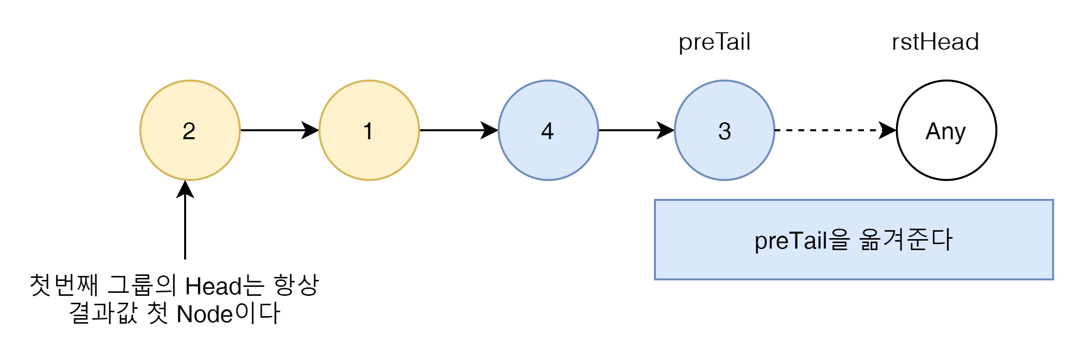 만약에 첫번째 그룹이 정리 되고 두번재 그룹이 오게된다면 반듯이 preTail의 마지막에 현 loop의 head를 붙여 줘야 한다.