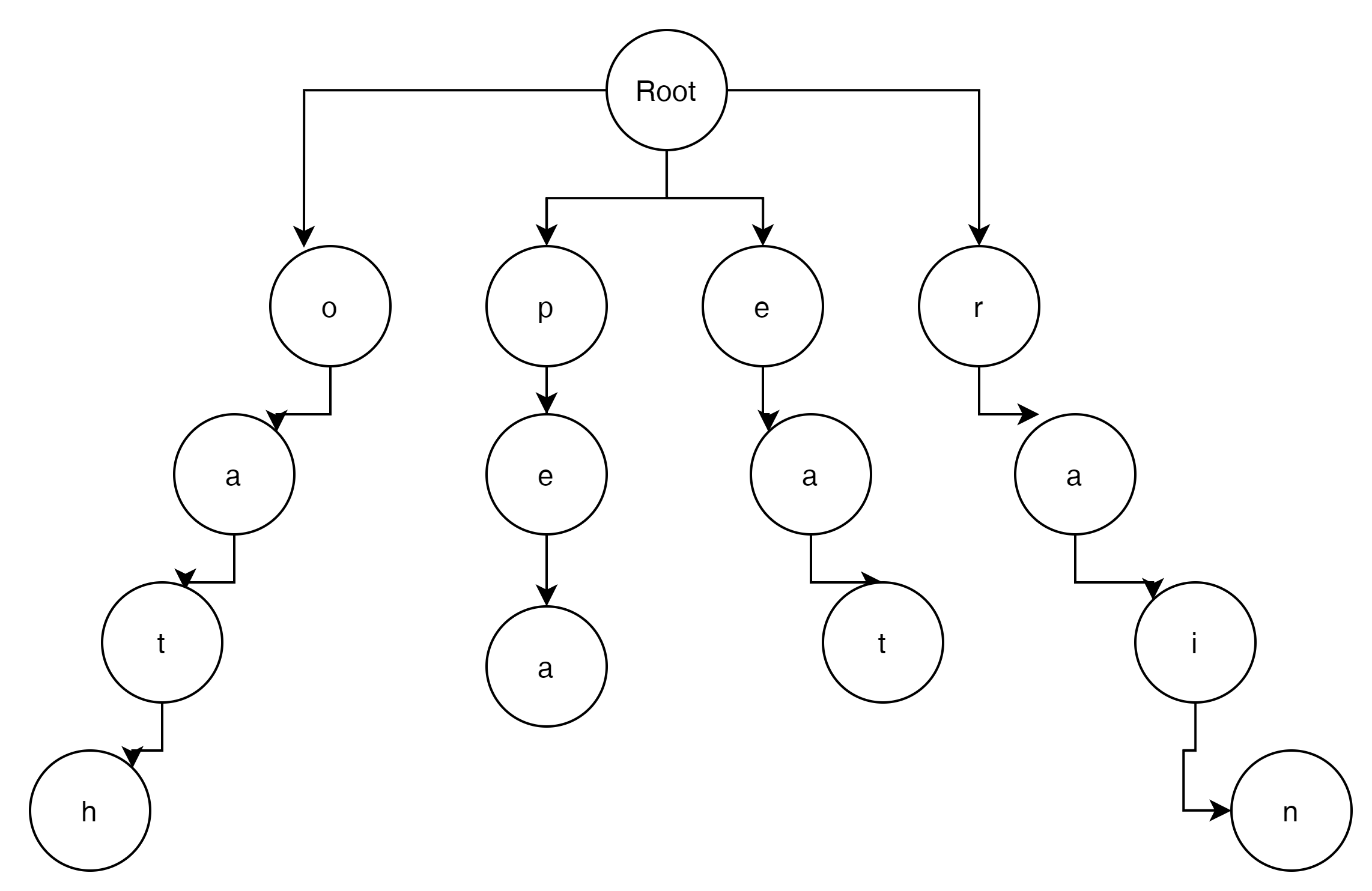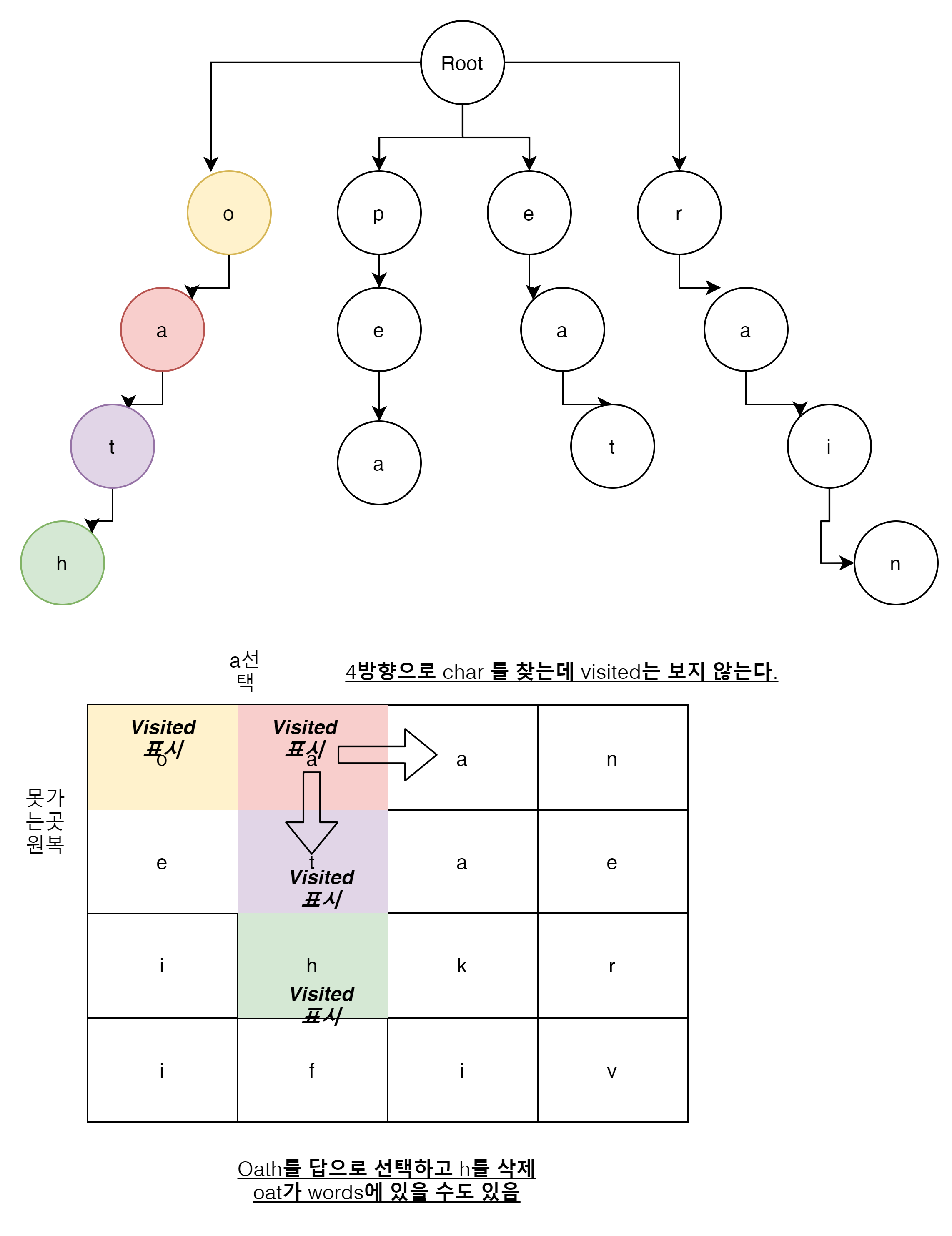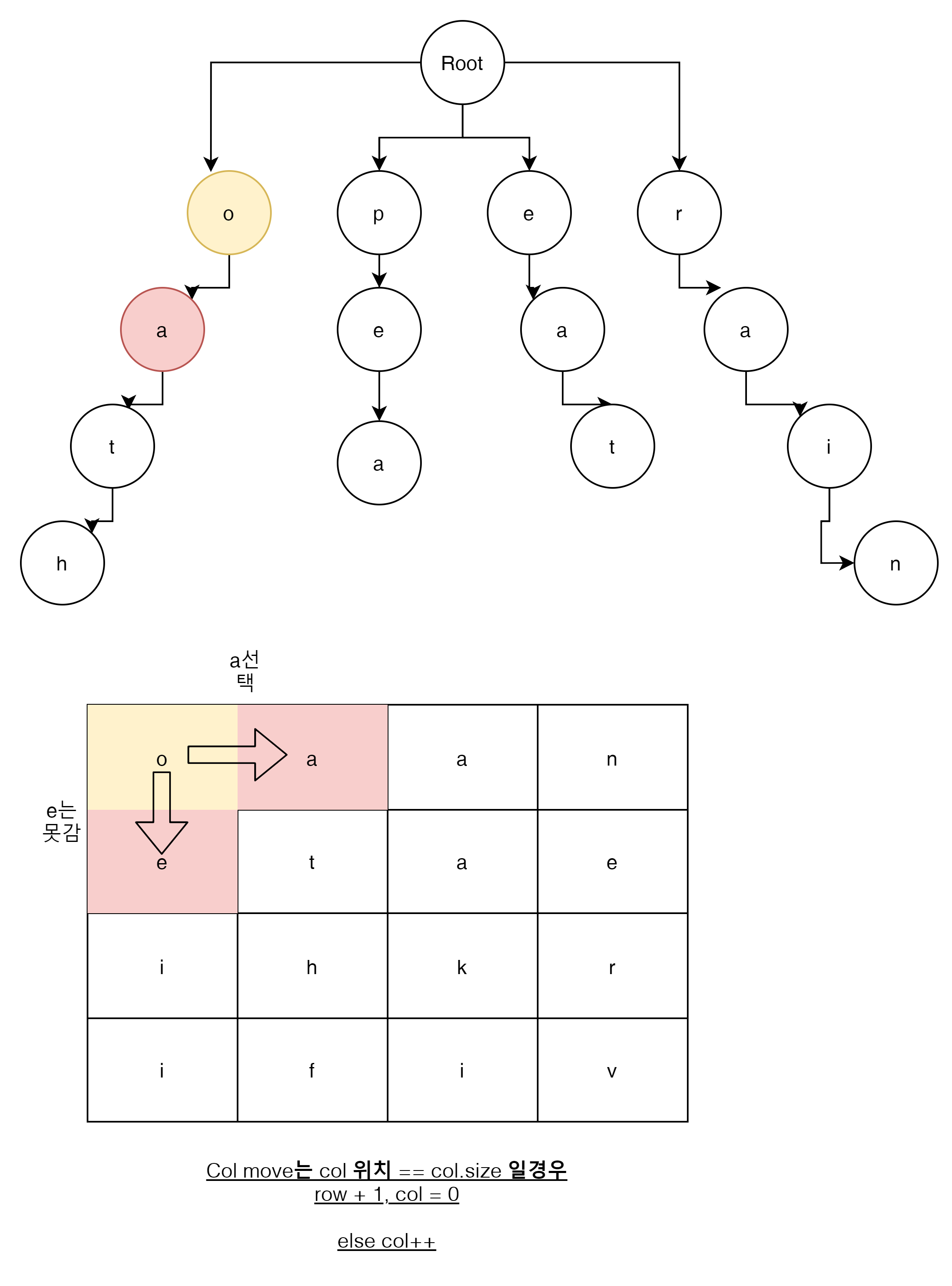 o에서 node가 있는가? o의 sub node 중에 'e' 또는 'a'로 시작하는 node가 있는가?