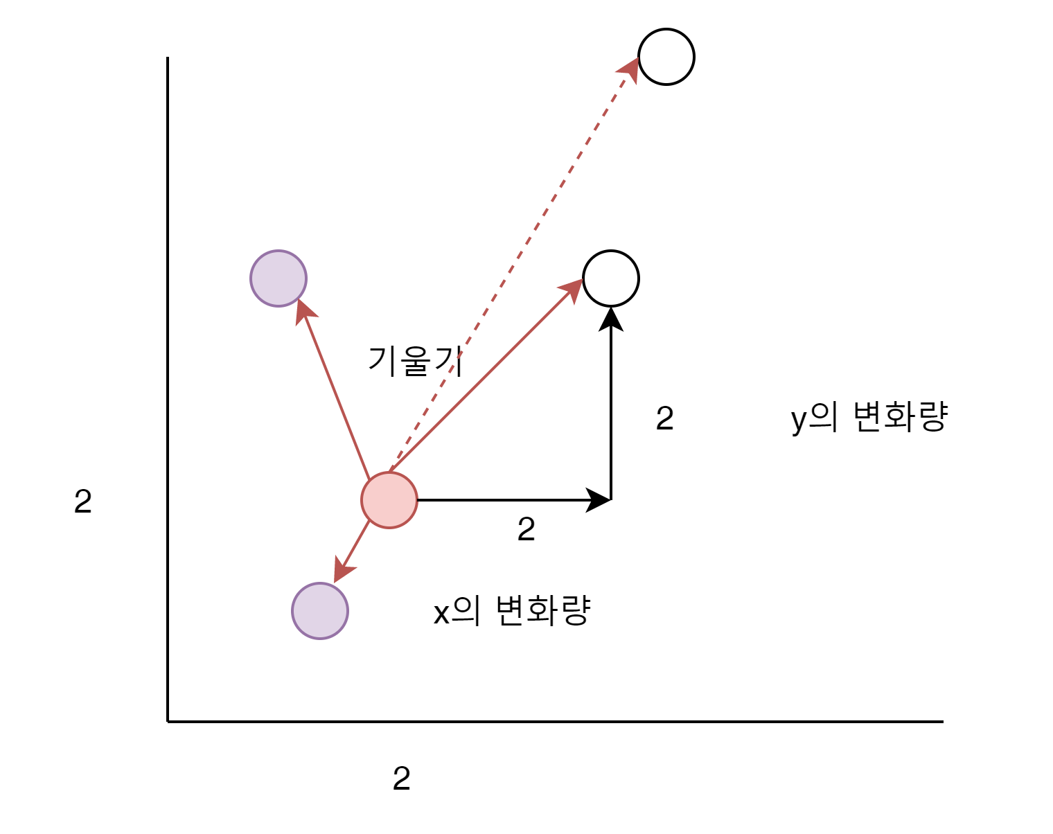 (2,2)에서 출발하는 점에서 다른 점으로의 한 선을 그었을 때 관심 있는 것은 오직 기울기 뿐이다.