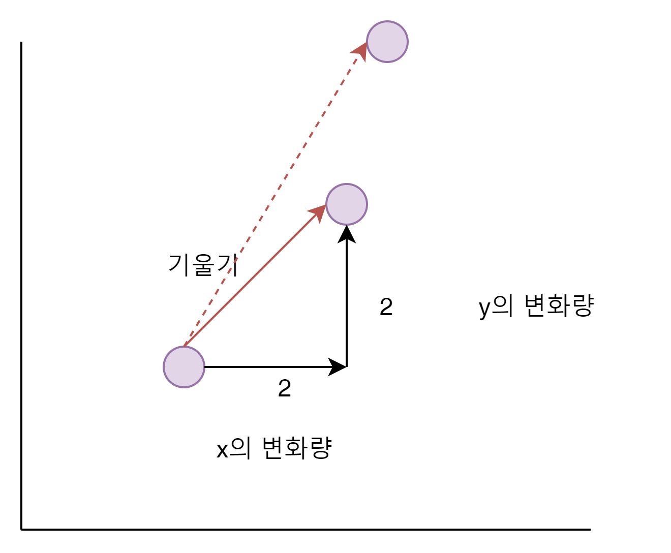 $$ y의 변화량 / x의 변화량 = (y2 - y1) / (x2 - x1) = (y2 - y1) / (x2 - x1) = slope $$