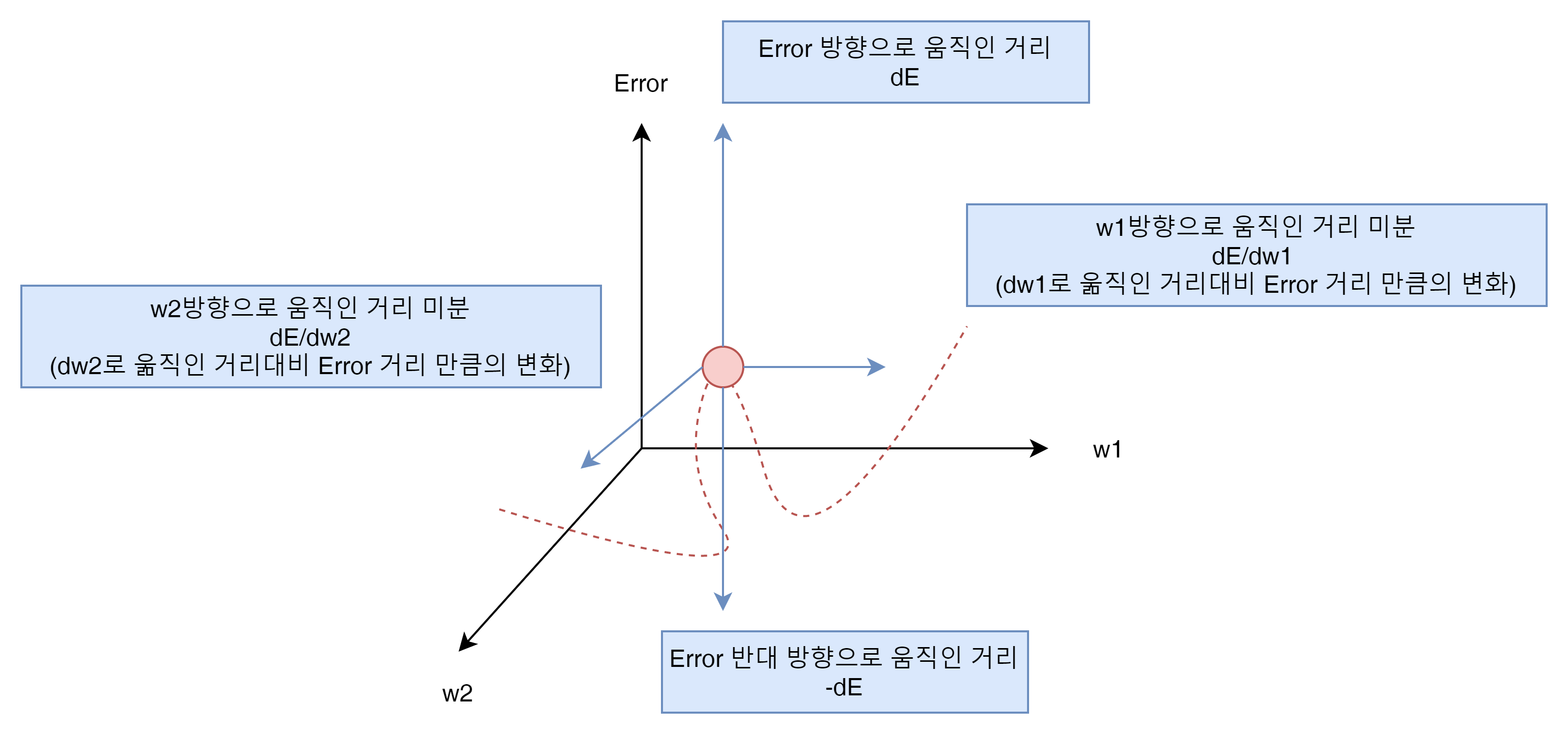 만약에 w1을 조금 움직이고 w2를 조금 움직인다면 우리는 이 변화량이 Error 좌표에 어느정도 변화를 주는 가를 확인 할 수있다.