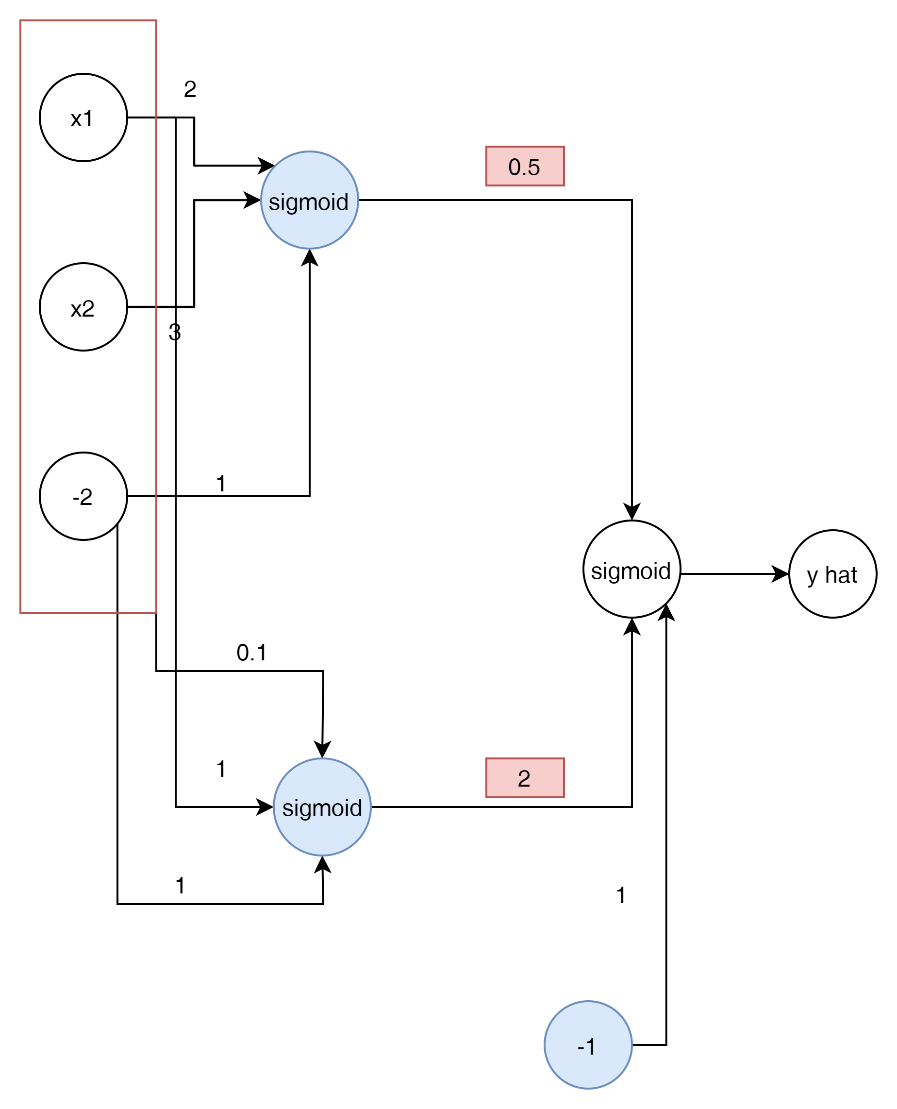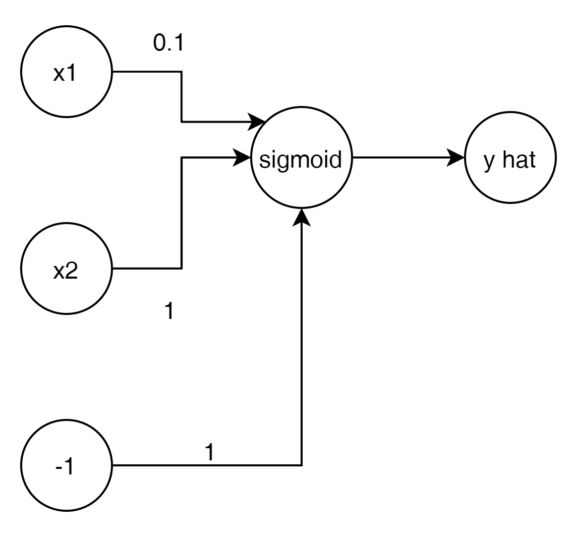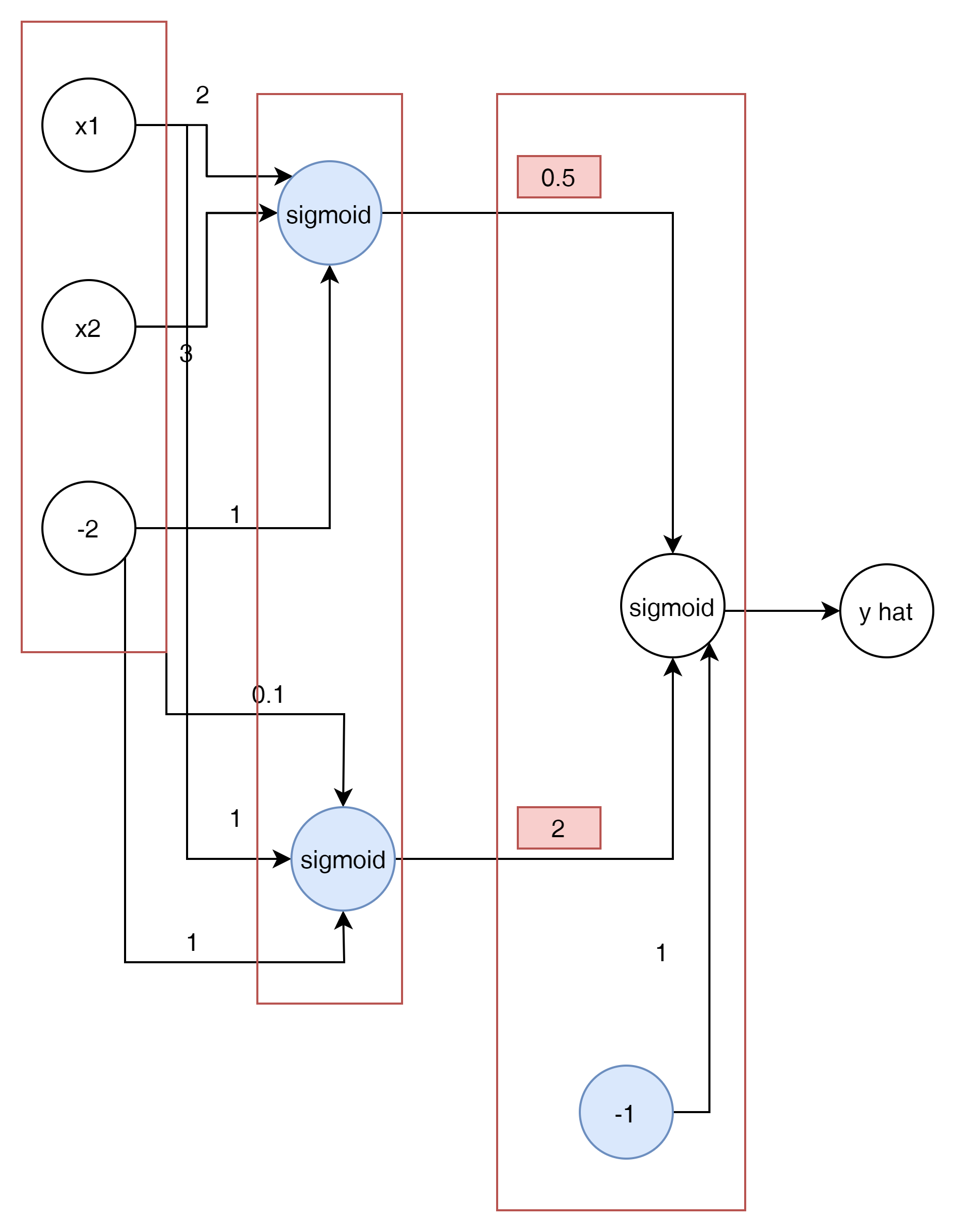 $$ \hat{y} = \sigma \begin{pmatrix} {w^{2}}_{11} \\ {w^{2}}_{21} \\ {w^{2}}_{31} \end{pmatrix} \sigma \begin{pmatrix} w_{11} && w_{12} \\ w_{21} && w_{22} \\ w_{31} && w_{32} \end{pmatrix} \begin{pmatrix} x_1 \\ x_2 \\ -2 \end{pmatrix} $$