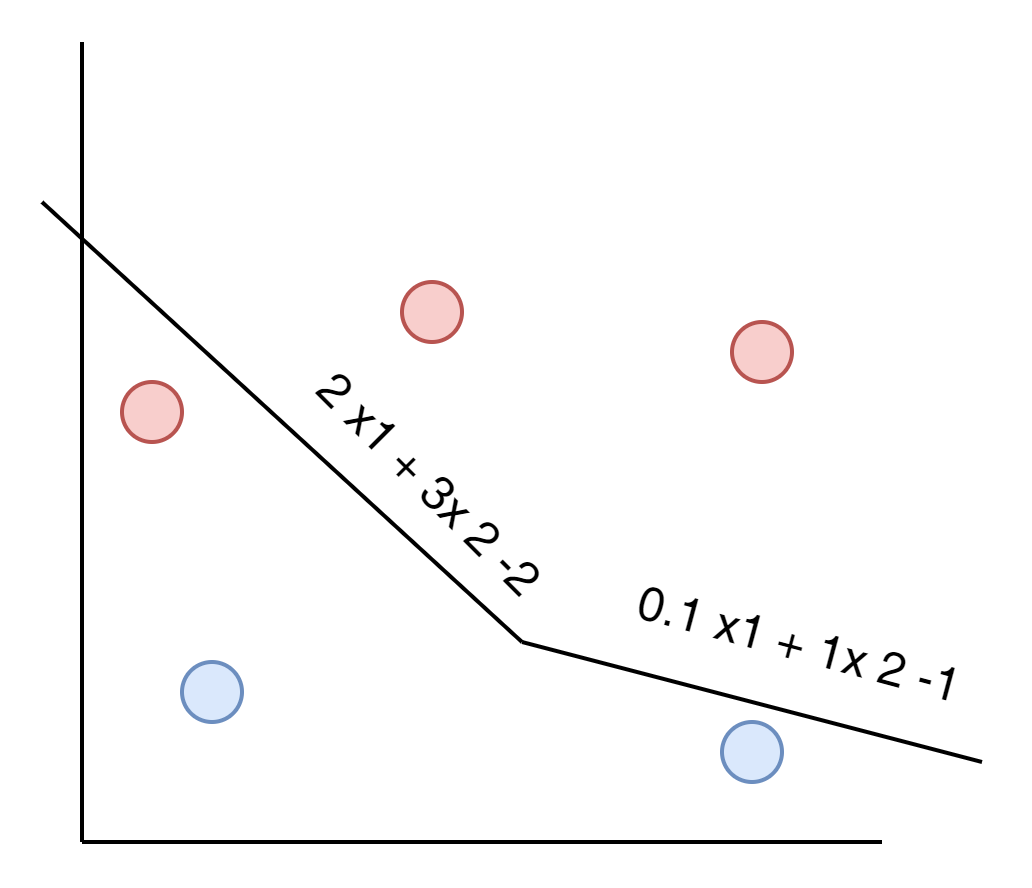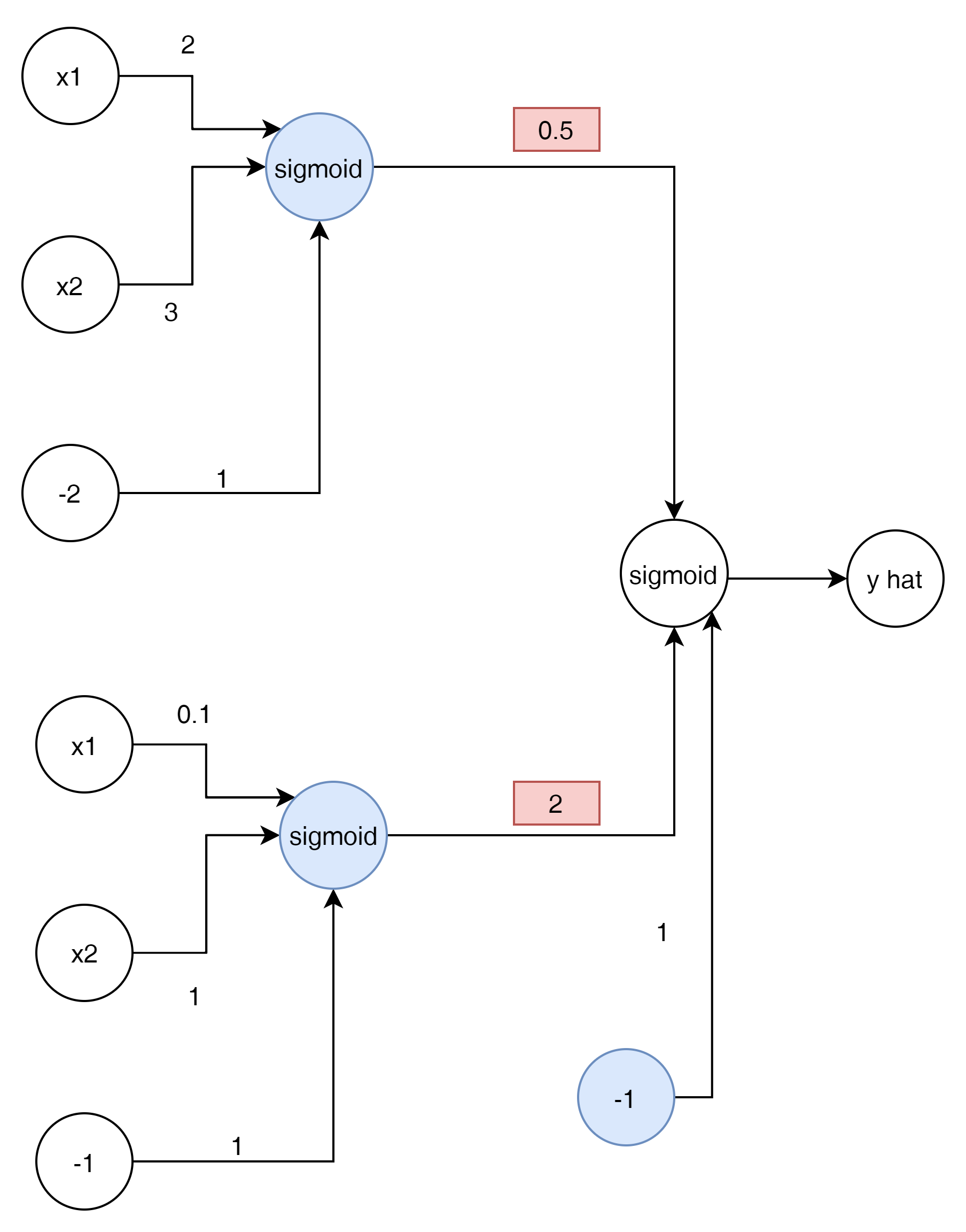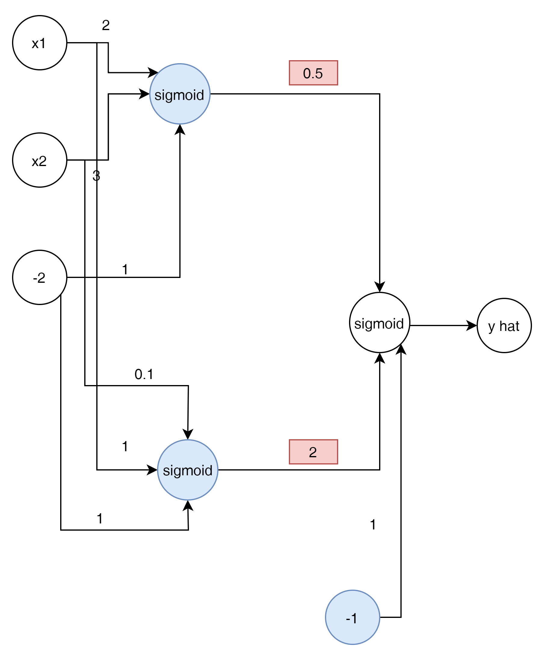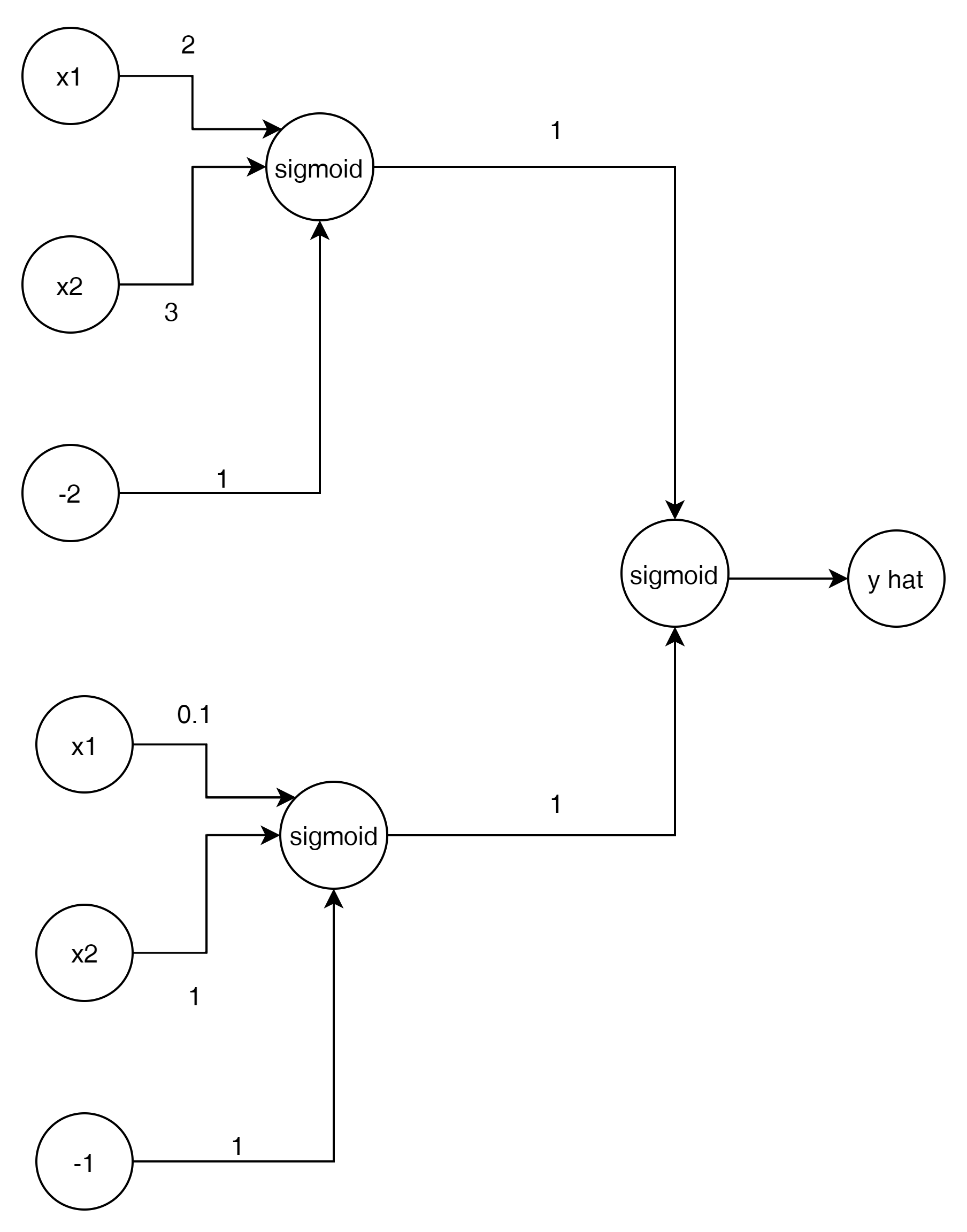 $$ \hat{y} = \sigma \begin{pmatrix} {w^{2}}_{11} \\ {w^{2}}_{21} \\ {w^{2}}_{31} \end{pmatrix} \sigma \begin{pmatrix} w_{11} && w_{12} \\ w_{21} && w_{22} \\ w_{31} && w_{32} \end{pmatrix} \begin{pmatrix} x_1 \\ x_2 \\ -2 \end{pmatrix} $$