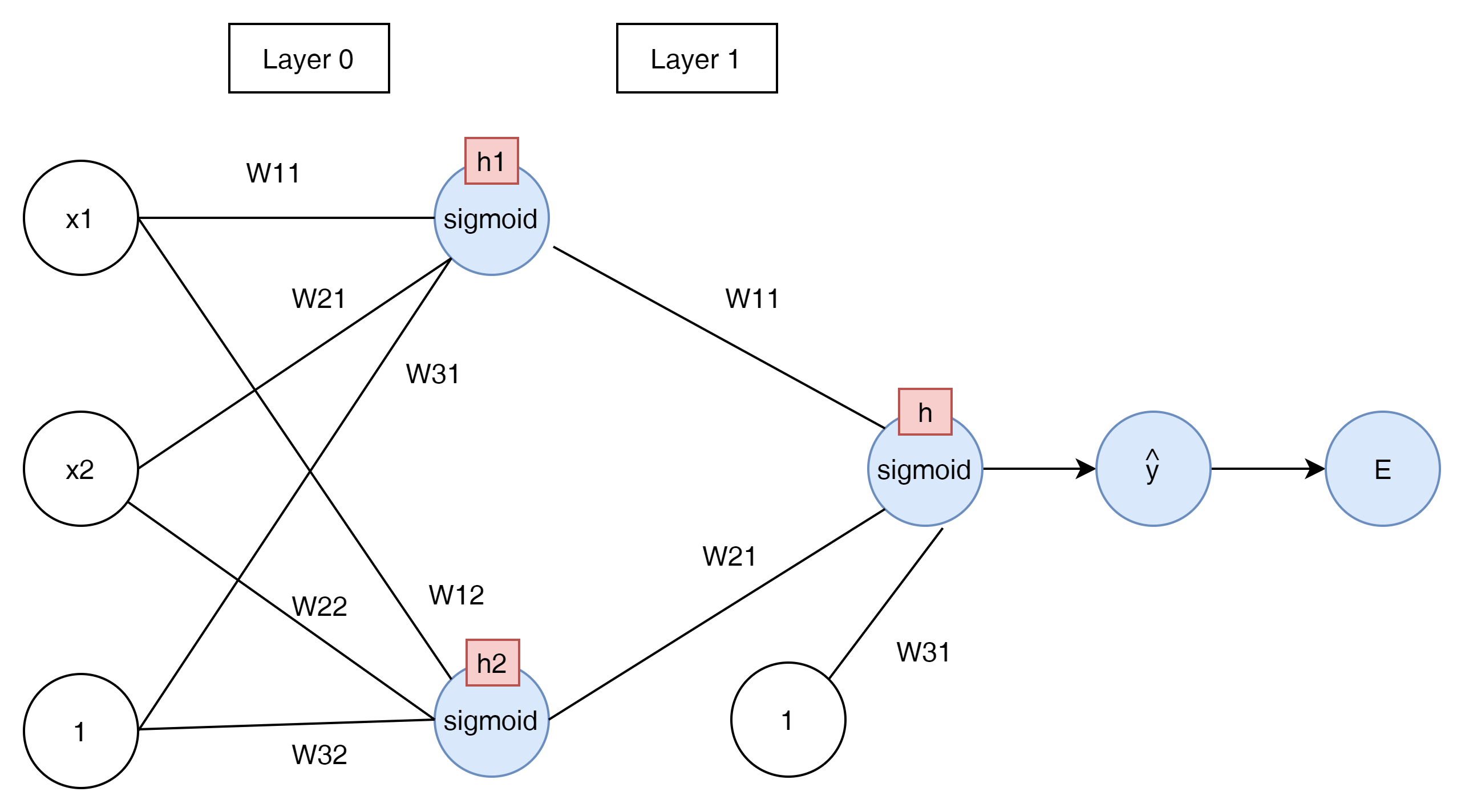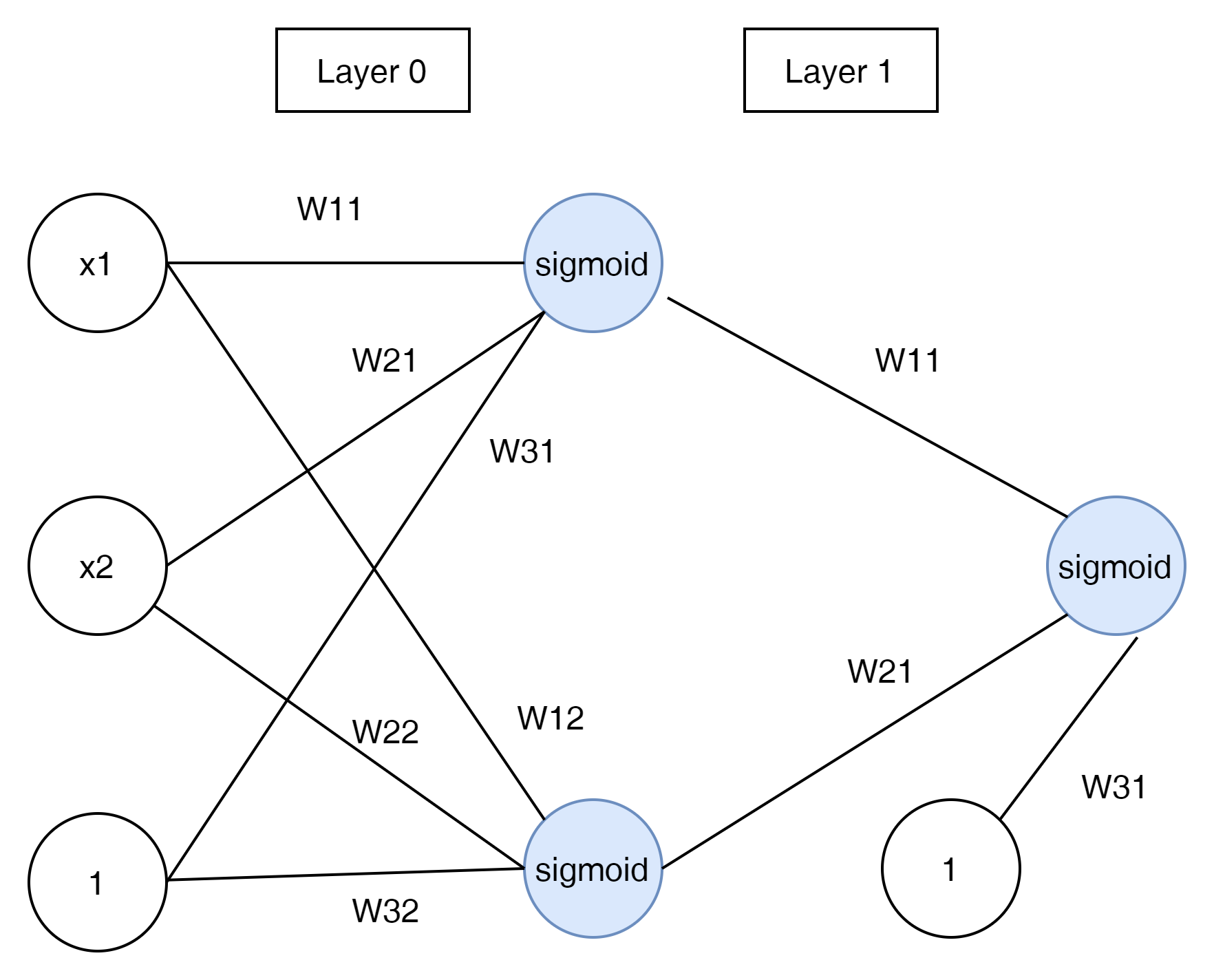 $$ \hat{y} = \sigma \begin{pmatrix} {w^{2}}_{11} \\ {w^{2}}_{21} \\ {w^{2}}_{31} \end{pmatrix} \sigma \begin{pmatrix} w_{11} && w_{12} \\ w_{21} && w_{22} \\ w_{31} && w_{32} \end{pmatrix} \begin{pmatrix} x_1 \\ x_2 \\ 1 \end{pmatrix} $$