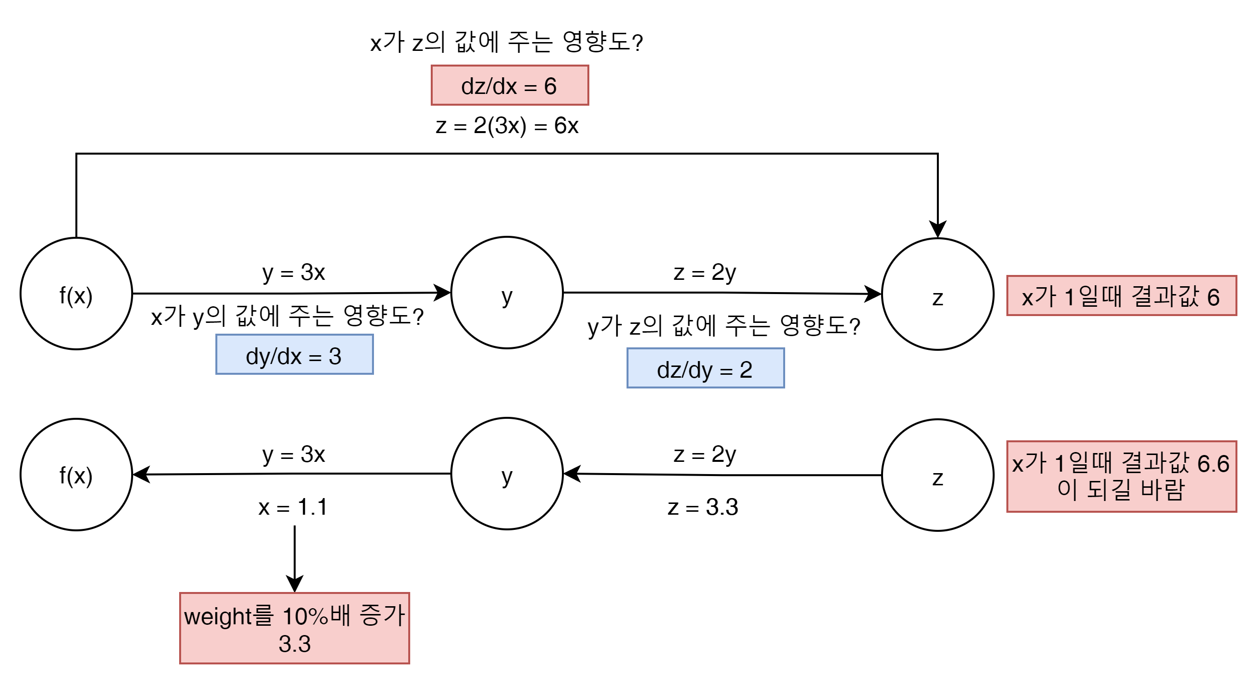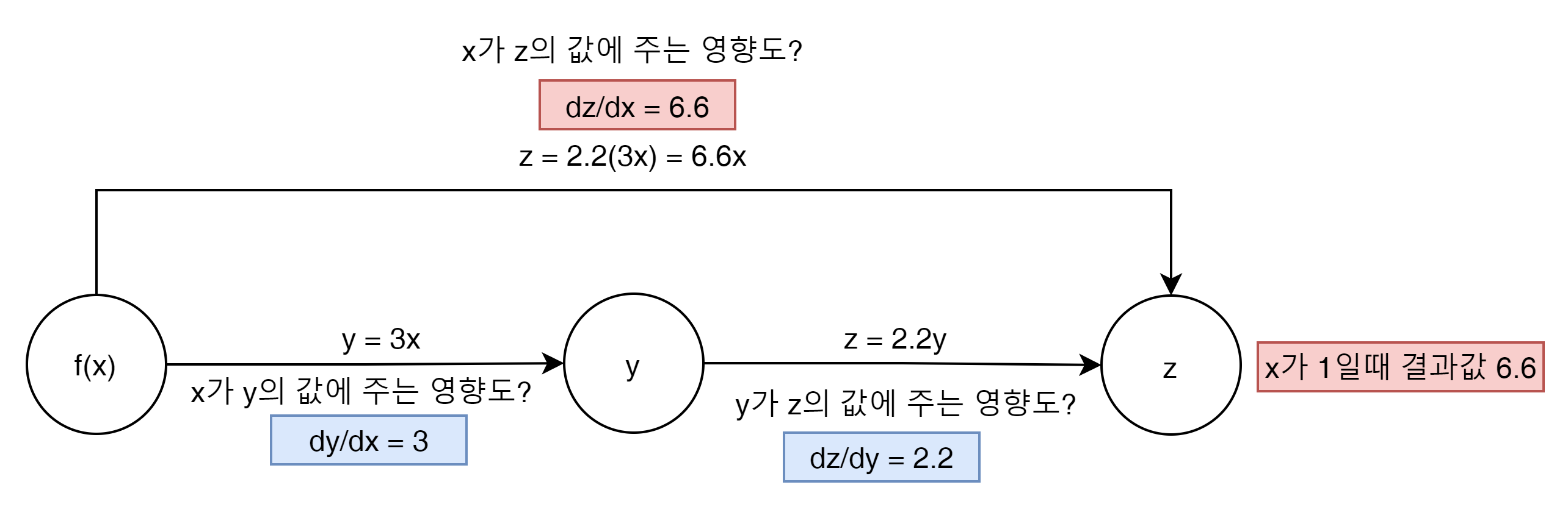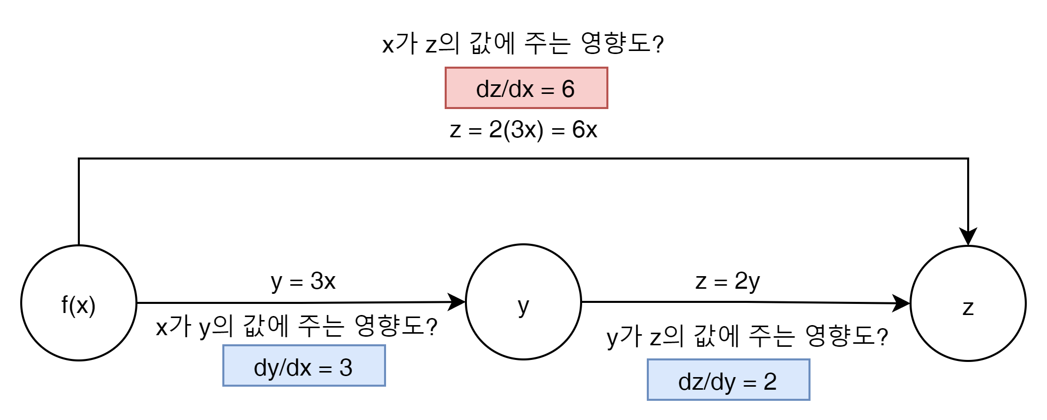 f(x) = y일때 y = 3x일 경우 y에 대한 x의 미분을 하면 결과는 3이된다. 이 결과를 갖는 y로 z를 미분하면 이것은 2가 되고 이 두개의 미분한 결과 값은 궁극적으로 z를 x로 미분한 값과 같게 된다.
