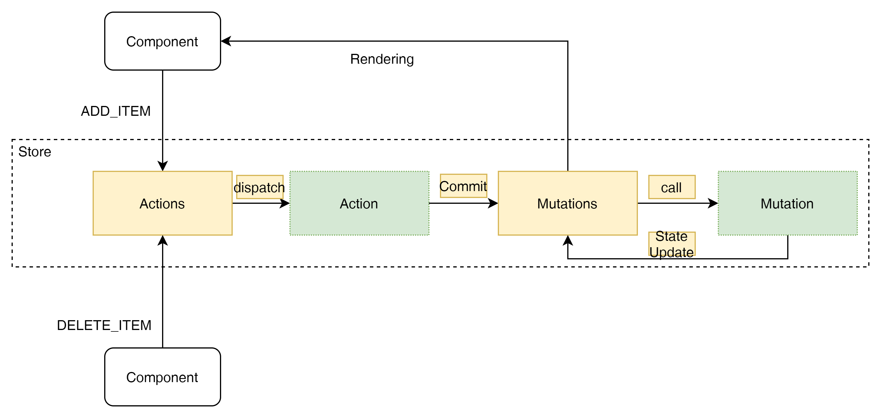 위의 그림은 Component가 각각 ADD_ITEM, DELETE_ITEM Action을 CALL하고 Strore에서 이에 관련있는 Action을 찾아 Dispatch하고 Action은 Business Logic을 수행하고 Mutation에 Commit함으로써 State를 최종적으로 Update하게 된다.