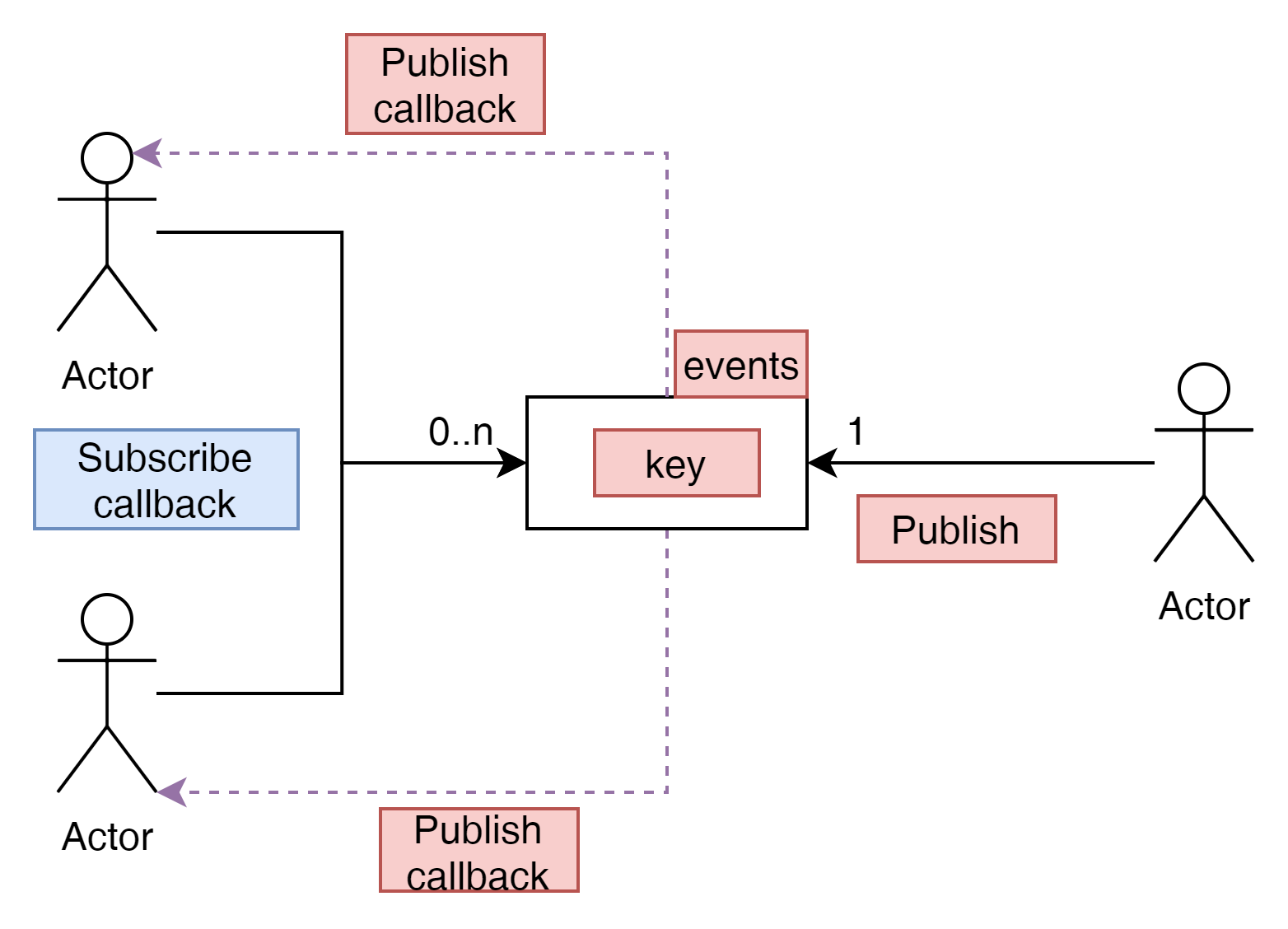 위의 코드에서 events는 channel 명이라고 생각하면 된다. subscribe는 events에 특정키에 Publish가 발생하면 수신을 받을 Subscriber 의 명시적 행위이다.