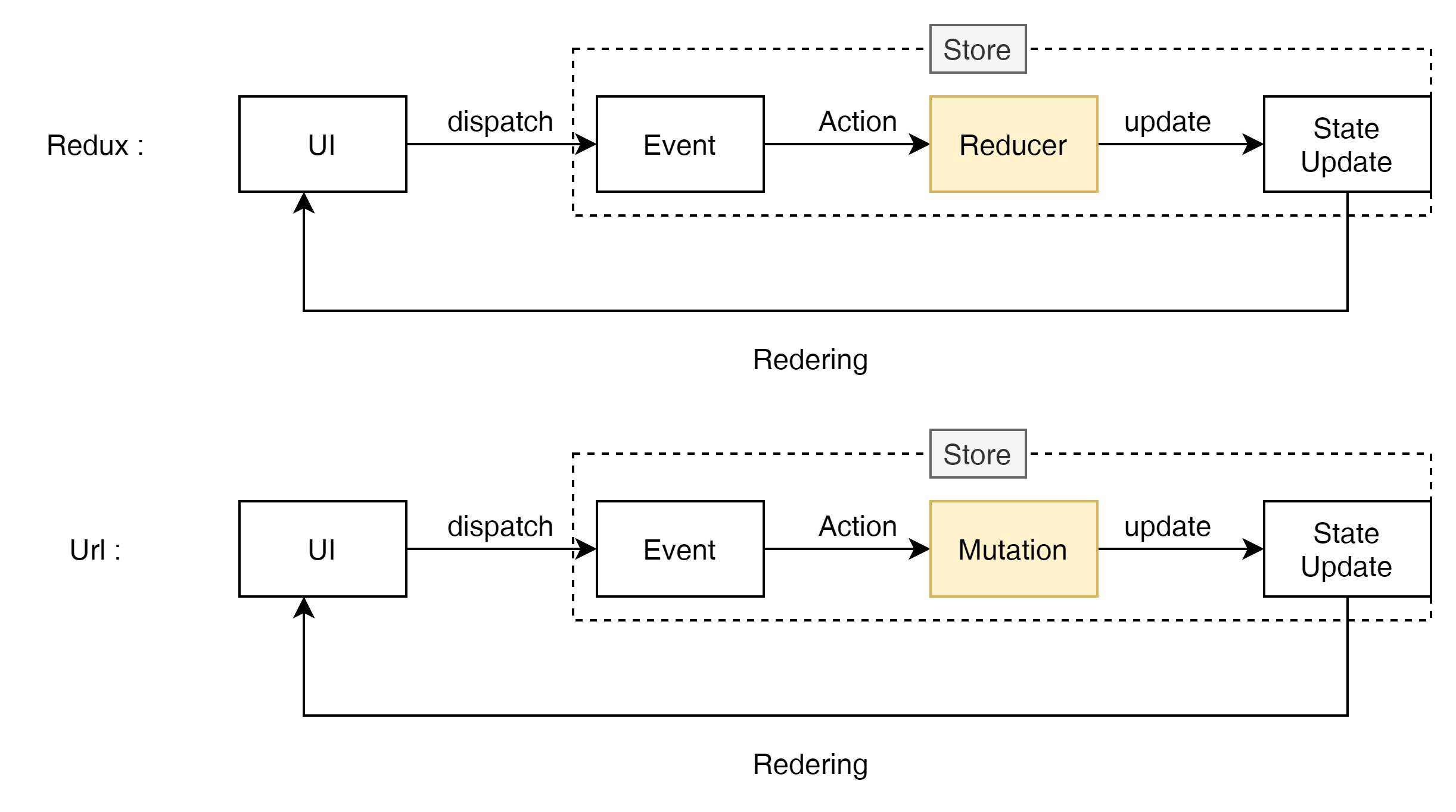 - Action은 component가 하지 않는다. 모든 Action은 Store에 위임한다.
