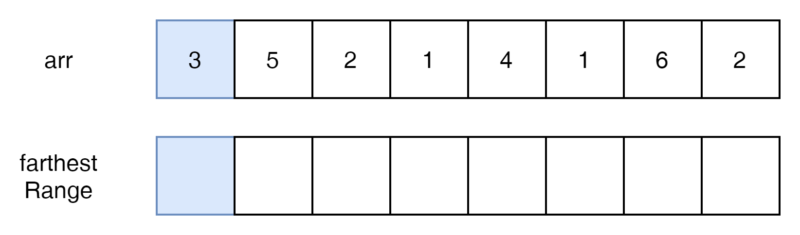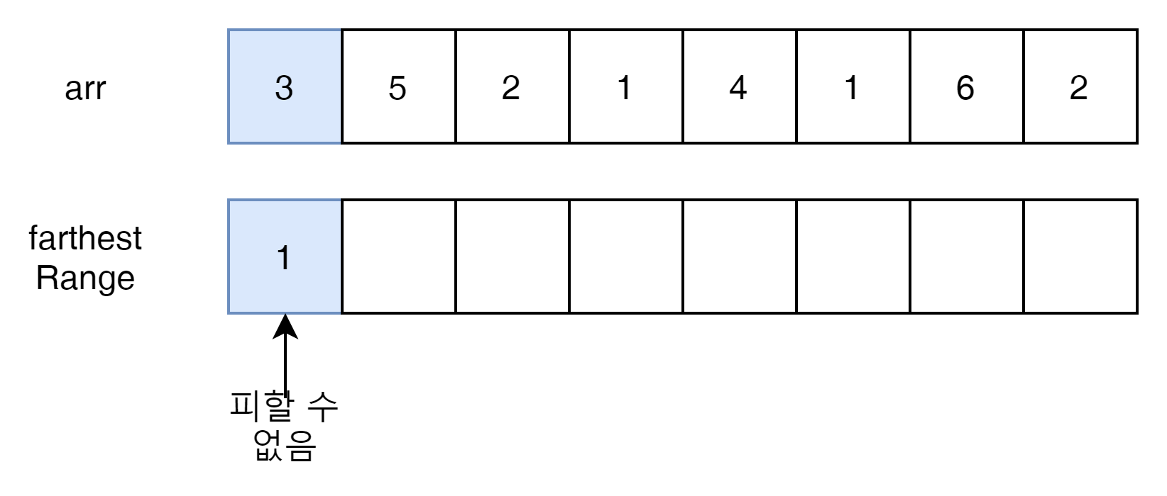 해당 Array index 0에서 출발한다고 할때, Jump가 가능한 범위는 arr[i]라고 할 수 있다.