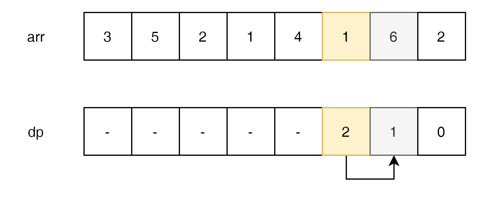 dp는 현재 index에서 마지막 index 7인 '2'까지 최소한의 jump를 기록 한다고 정의하자.