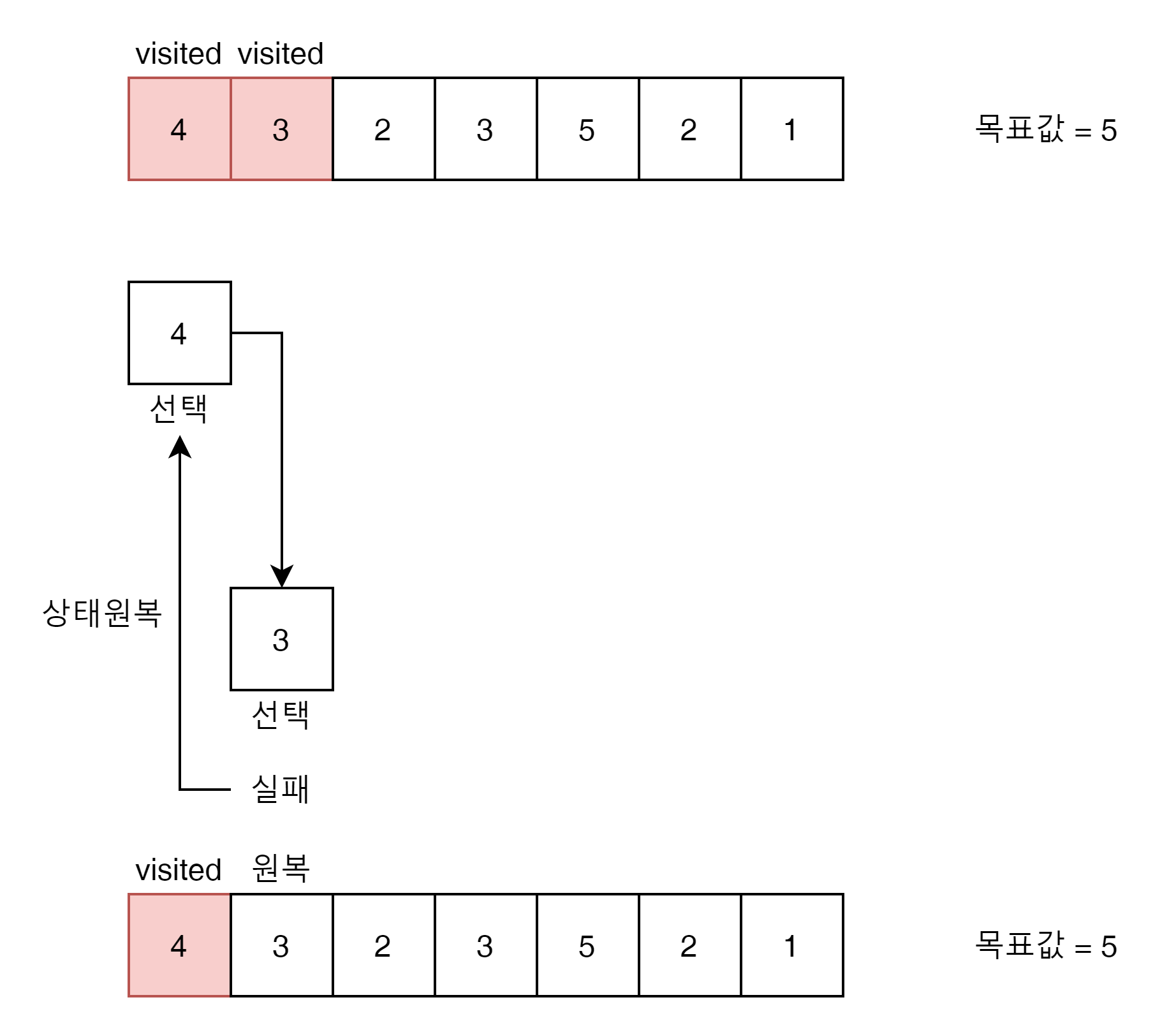 위의 경우를 보자면 4를 선택하고 3을 선택하면 목표값 5가 넘어가기 때문에, 3을 다시 visited하지 않았다고 상태를 원복해 줬다. 그이유는 (3,2)라고 하는 5의 목표 선택지가 있는데 visited 를 그냥 두게 되면 해당 해답지를 영원히 찾지 못하는 상태가 되기 때문이다.