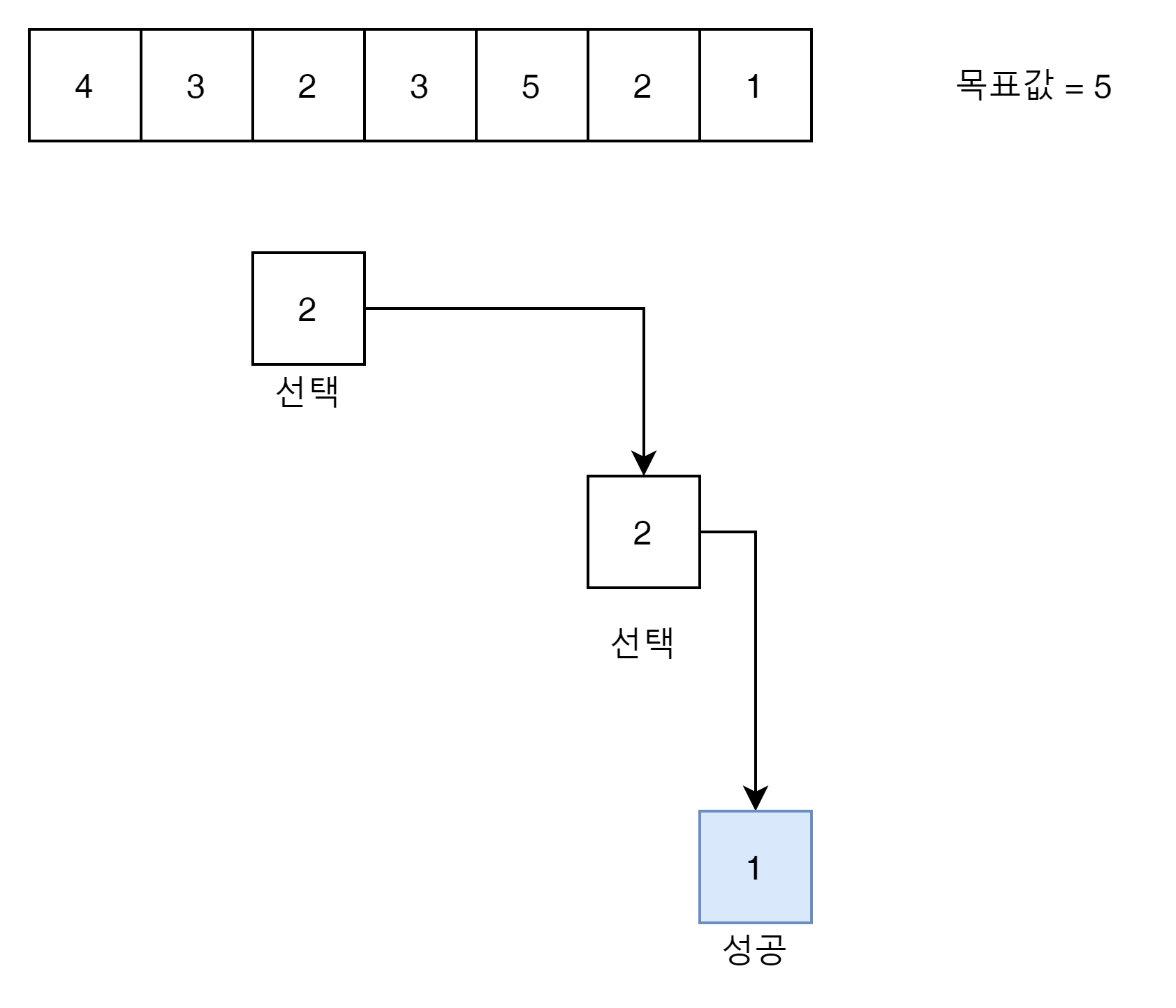 이제 목표값을 찾았다. 위의 array에서 5를 구성할 수 있는 subsets가 4개가 있는지 알아보면 된다.