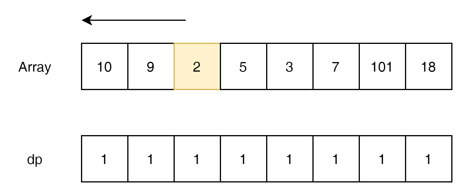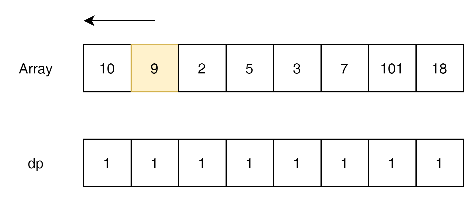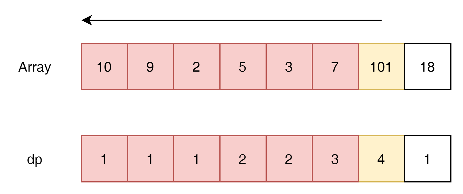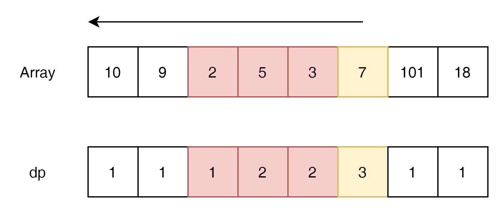 위에서는 sub-sequence의 count를 dp에 유지했다면, 여기에서는 가장긴 숫자의 값을 유지하는 방식으로 접근해 보겠다.
