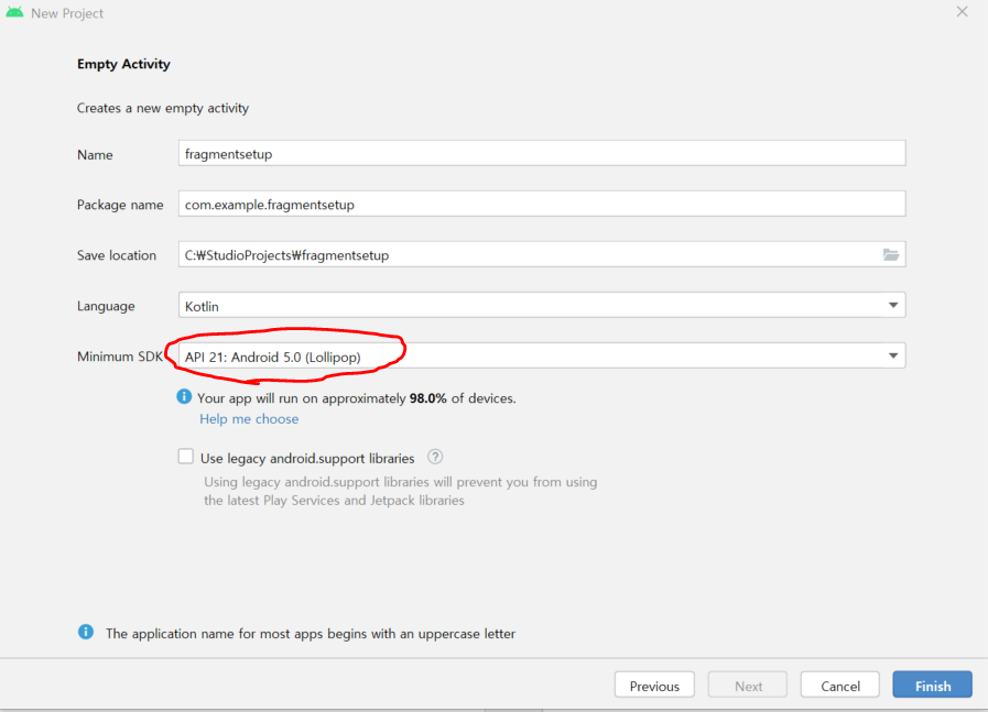 API 21기준으로 Minimum SDK를 설정해 준다.