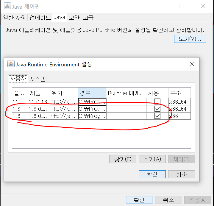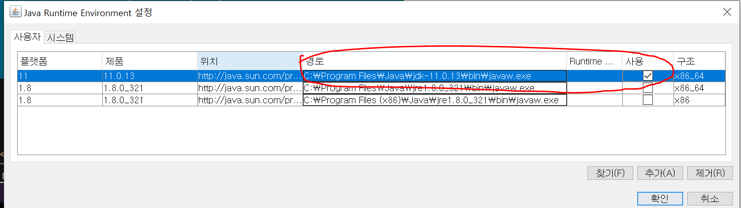 위와 같이 기존 1.8 사용을 모두 uncheck하고 11버전에 사용을 check해 준다.