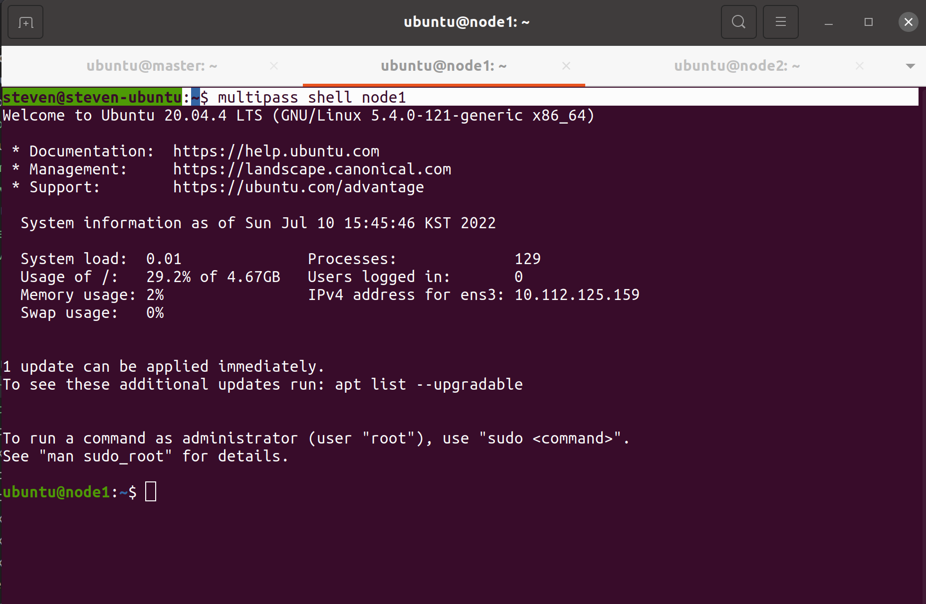 multipass의 shell 명령어를 이용해서 master, node1, node2에 shell 진입을 해주자.