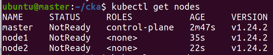 위에서 보면 get nodes의 결과에 Status가 NotReady인것을 확인 할 수있다.