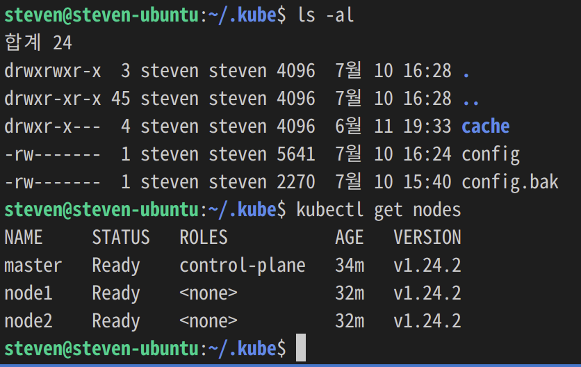 sft를 이용해서 master이하에 있는 ./kube/config 파일을 local computer의 ~/.kube/config로 변경시키고 난 후의 모습이다.