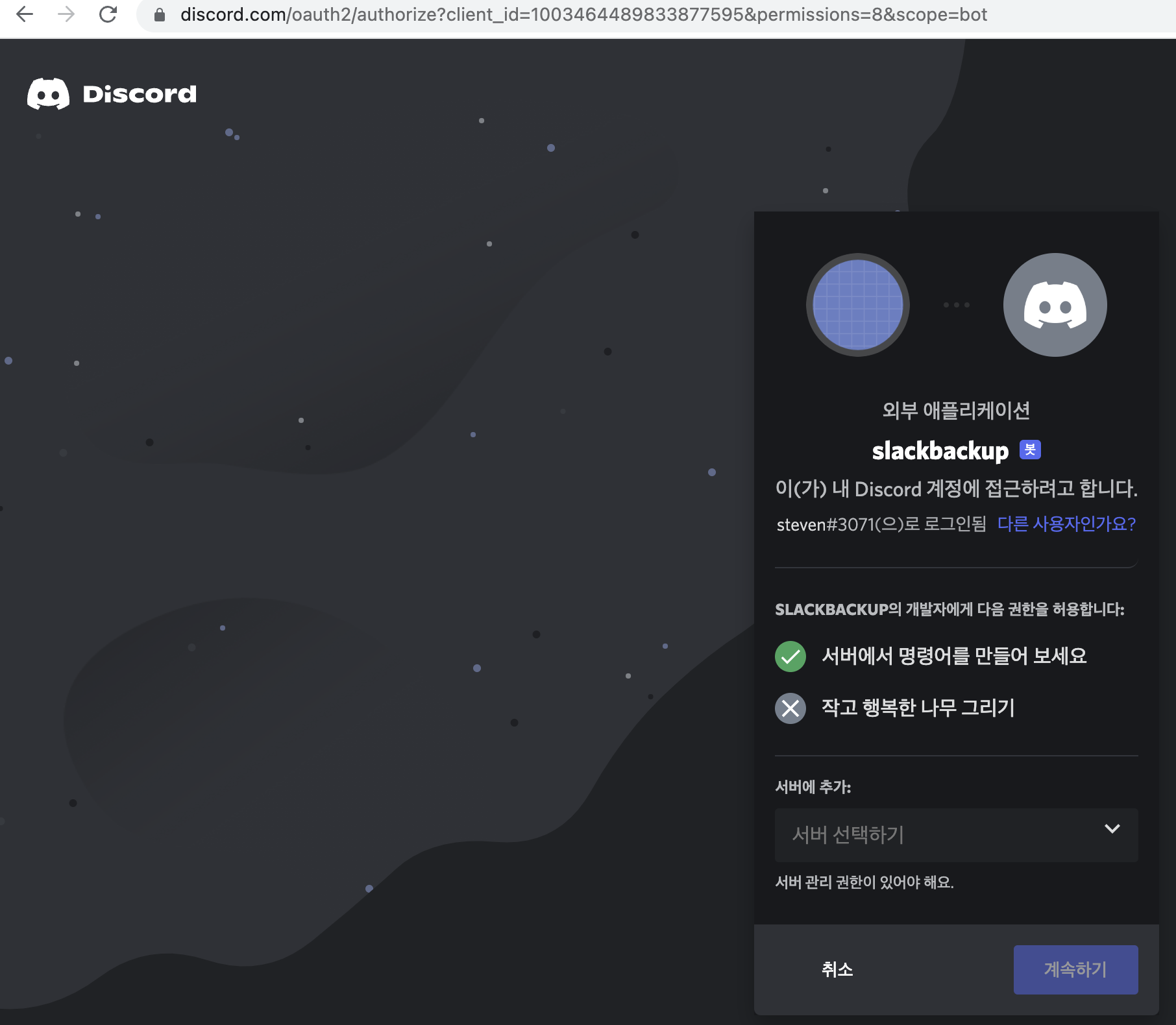 그러면 앞서 내가만든 서버(서버 선택하기 부분)를 선택할 수 있고, 선택이 완료 되면 나의 bot이 나의 서버에 참가한 것을 확인할 수 있다.