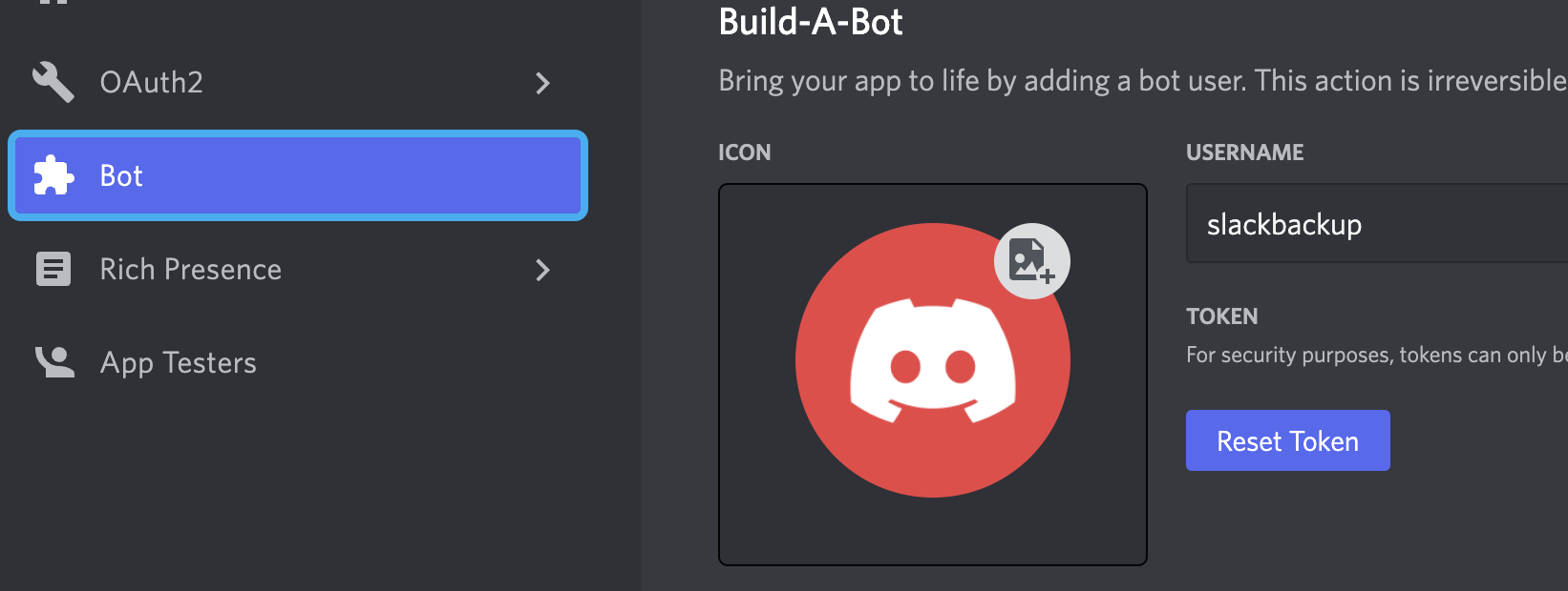 위에서 만든 Discord Application에서 Bot을 선택하고 우측에 Reset Token을 누르면 Token을 발행할 수 있다.