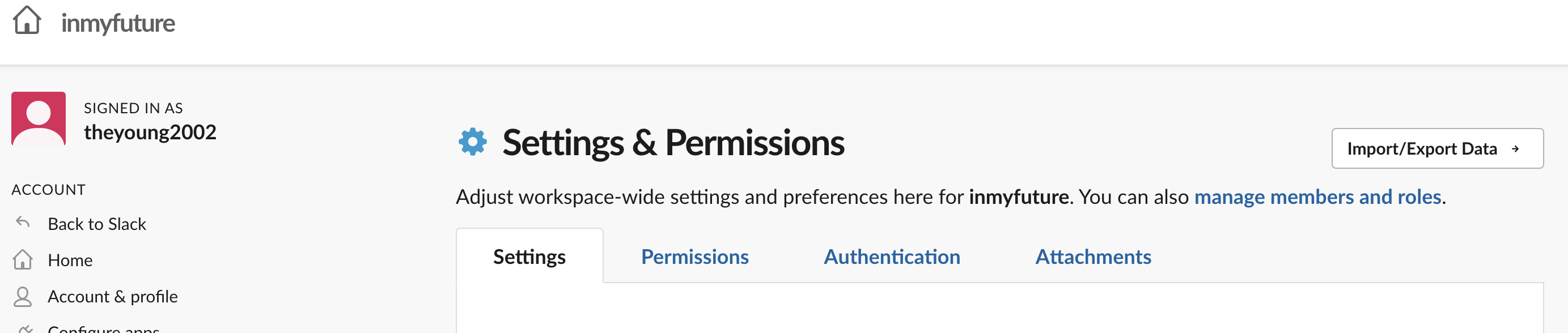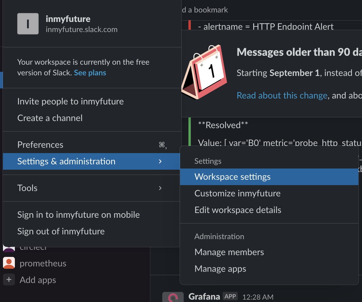 백업 하고자 하는 워크스페이스에서 Setting & administration을 선택하고 Workspace settings를 클릭한다.