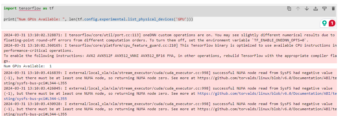 다음 코드를 입력 한 후 GPU의 갯수가 나오면 성공이다.