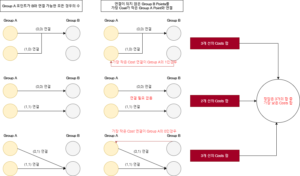 - 초기 접근 방법 : A group에 있는 포인트들의 최소값으로 B Point를 찾고 B Point 중 연결되어있지 않은 포인트 대상으로 최소값 연결을 찾아 A를 연결한다.