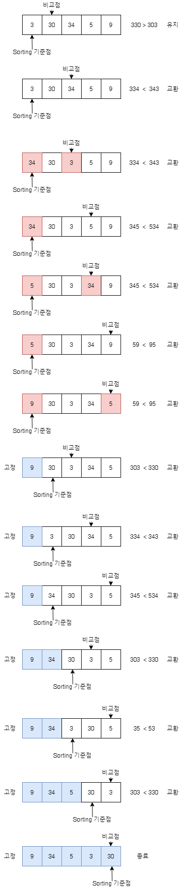 이런 방식으로 2개의 숫자를 합쳤을 때 가장 큰경우를 가장 앞으로 Descending 정렬을 시켜주면 된다.