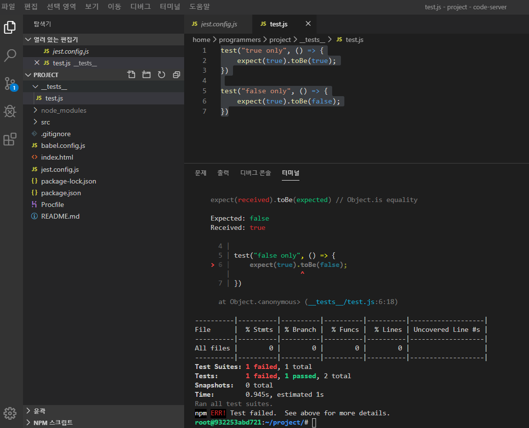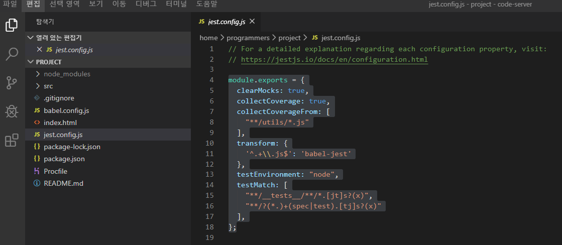 프로그래머스 vs code에서는 상기와 같이 jest test가 설정 되어있다. 이를 최대한 사용해서 test 코드를 짜보고자 한다.