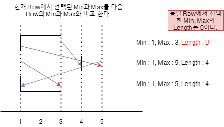상기의 그림과 같이 이전 Array에서 선택된 Min과 Max를 다음 Array의 Max와 Min과 비교해서 최대 Length를 남기는 방식으로 계산을 하게 되면, 만약 한 Array에 Min과 Max가 다 있다고 해도 이전 Min과 또는 Max와 비교하는 것이 되기 때문에 하나의 Array에서 Max와 Min을 선택해서 계산 하는 것은 피하게 된다.